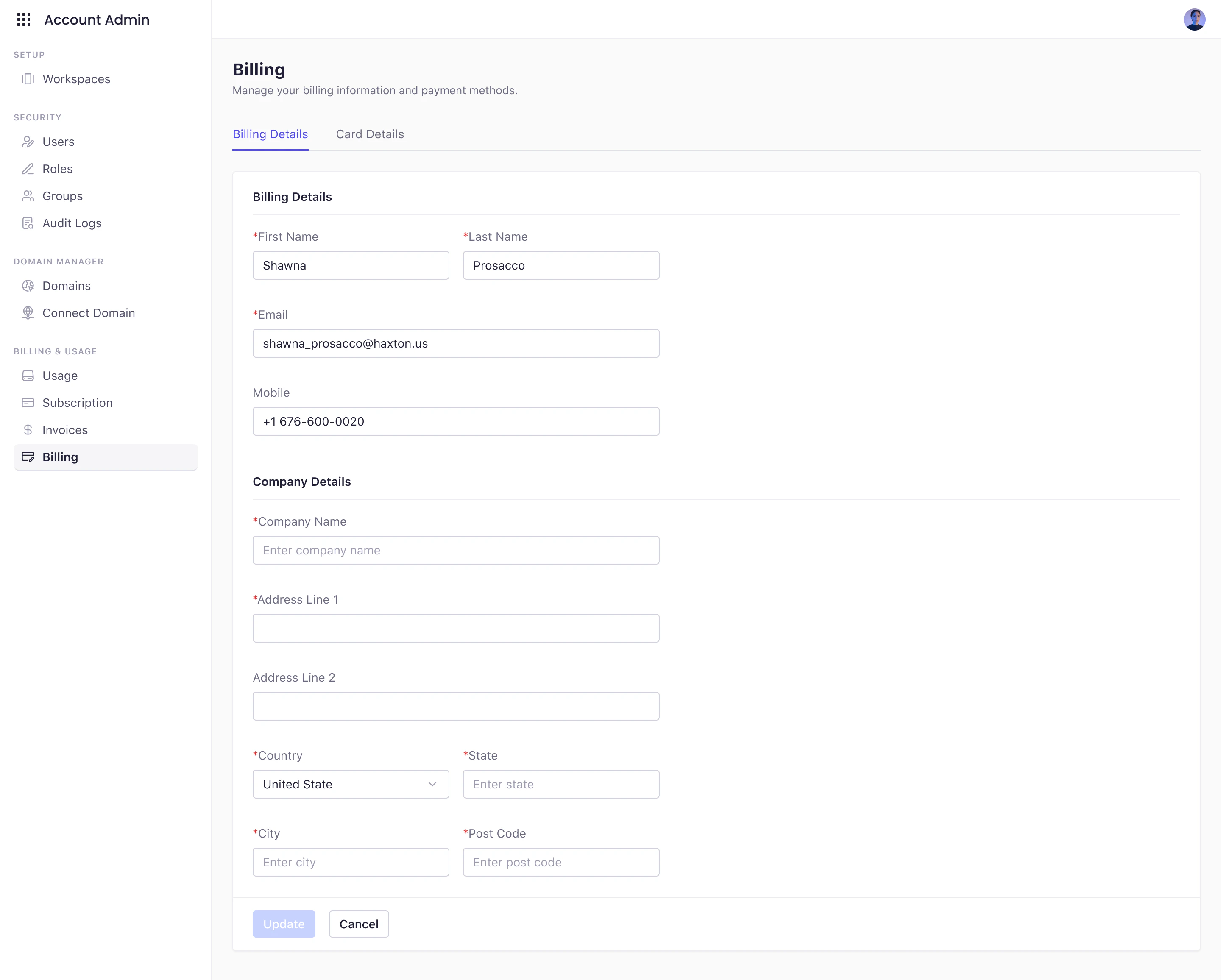 - Enter or Update Billing Information Provide the contact and address details that will appear on your invoices.