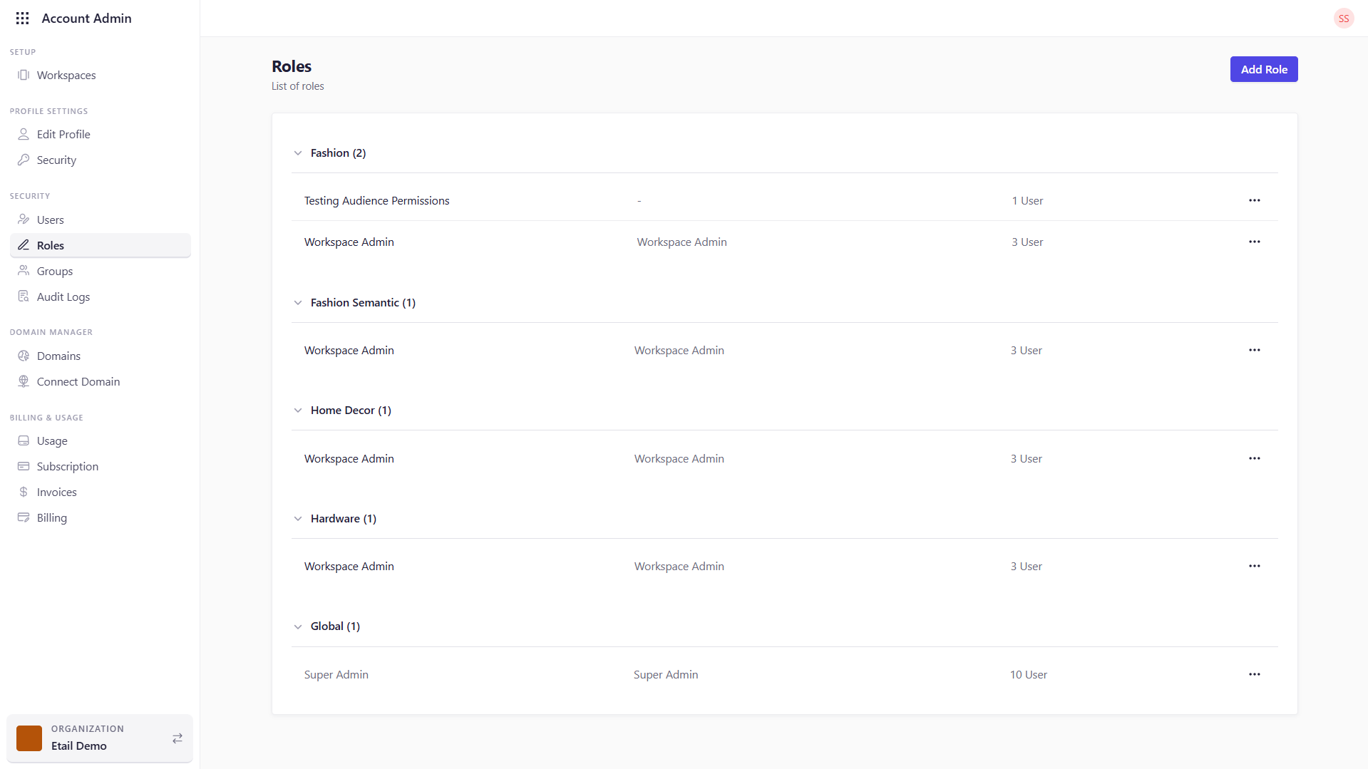 - Browse All Roles View every role defined globally or per workspace, with an indication of where each applies.