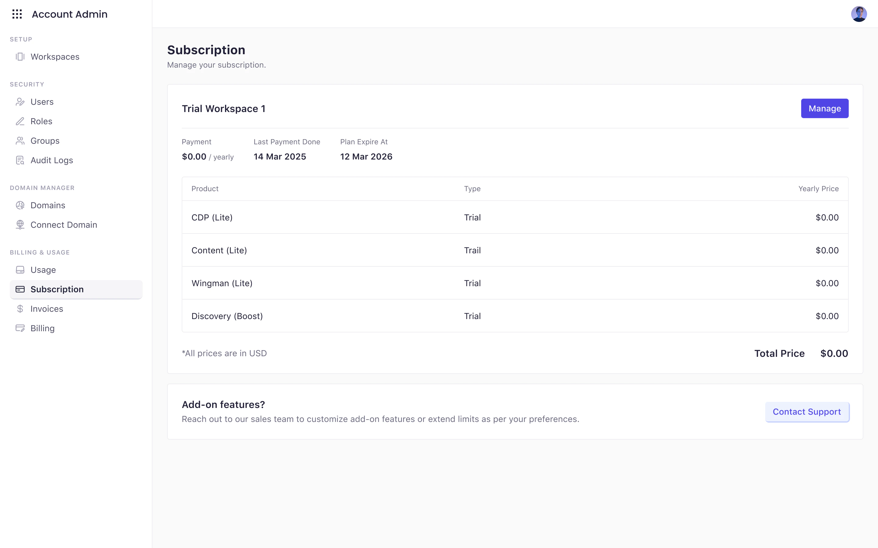 Click Manage next to any workspace subscription to: