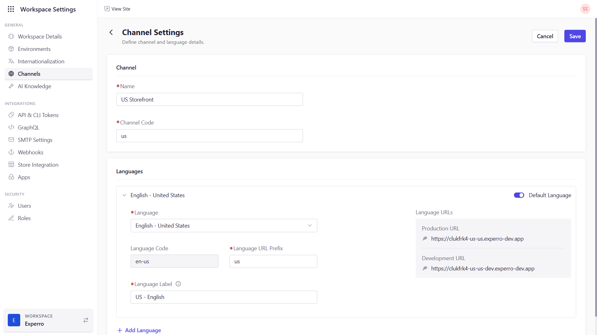 | Channel Code | A short identifier (e.g., us, fr, ca-en). Used internally and in URL generation. Must be unique across channels. |