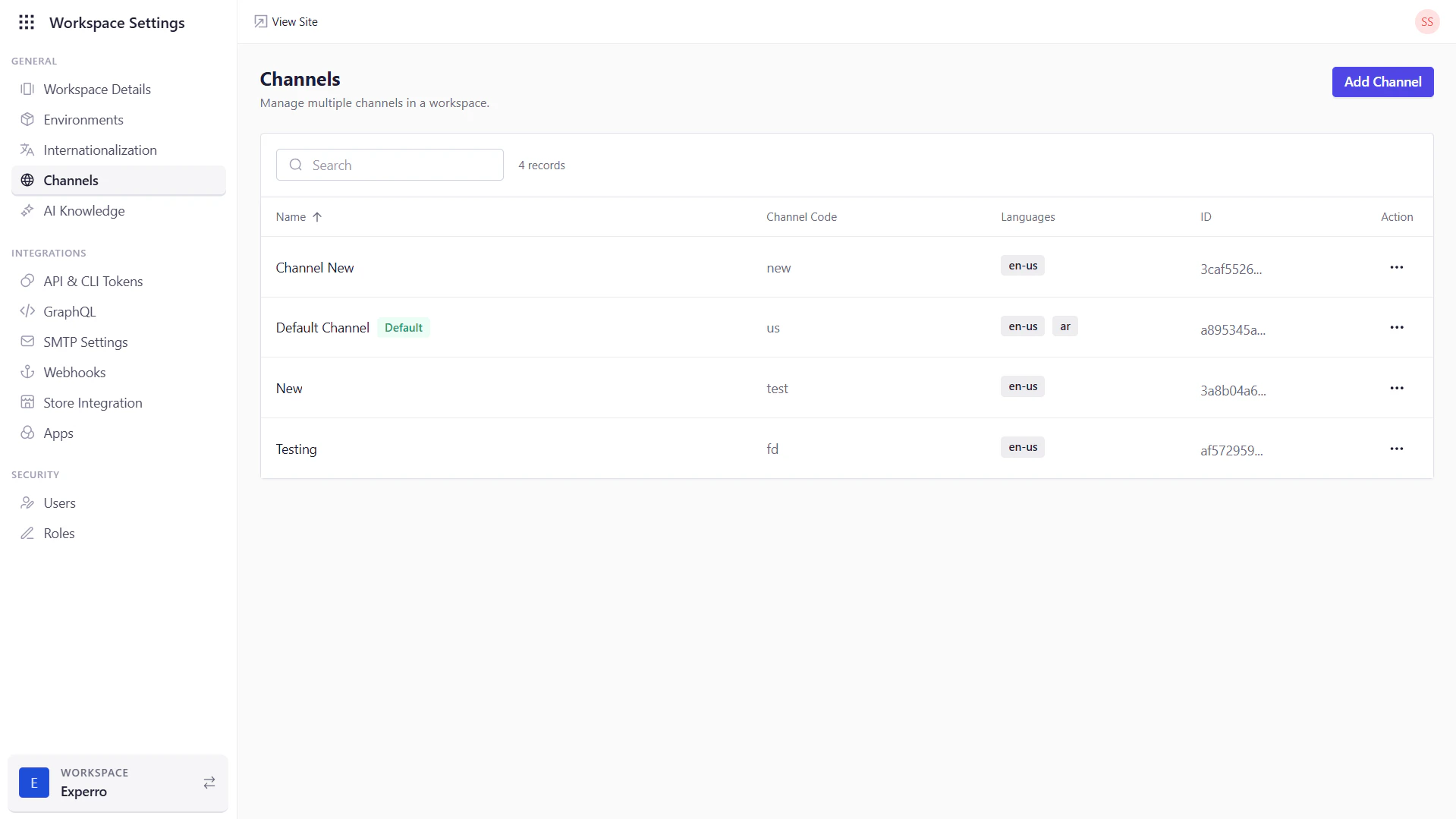- Browse Existing Channels – See every channel you’ve configured, including its code, supported languages, and unique ID.