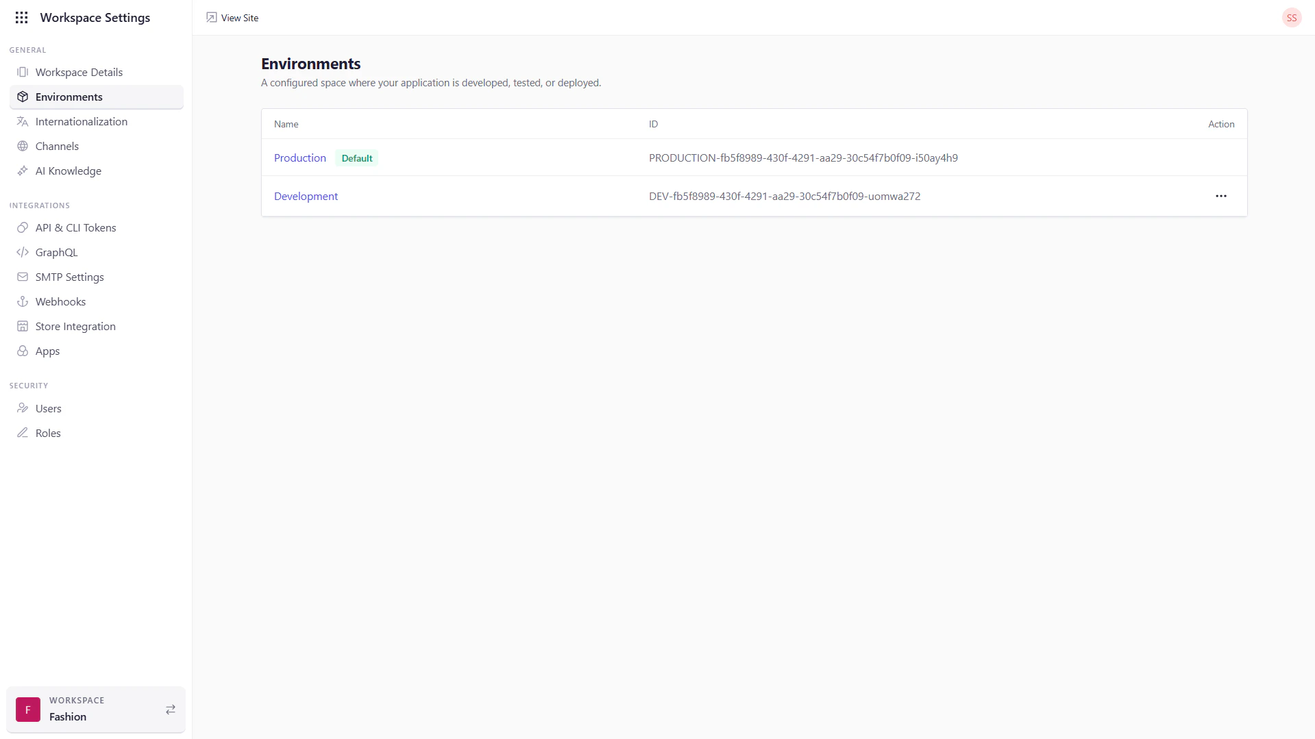 | Actions | Contains the Make Default button. Clicking Make Default will instantly switch the workspace’s default environment to the one in that row. Only one environment can be default at a time. |