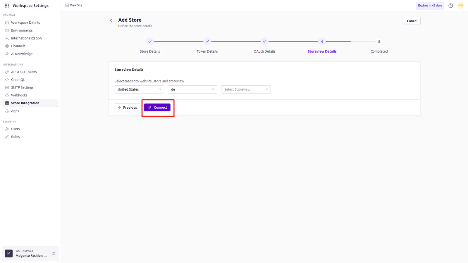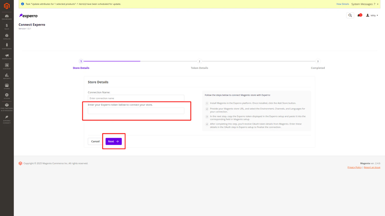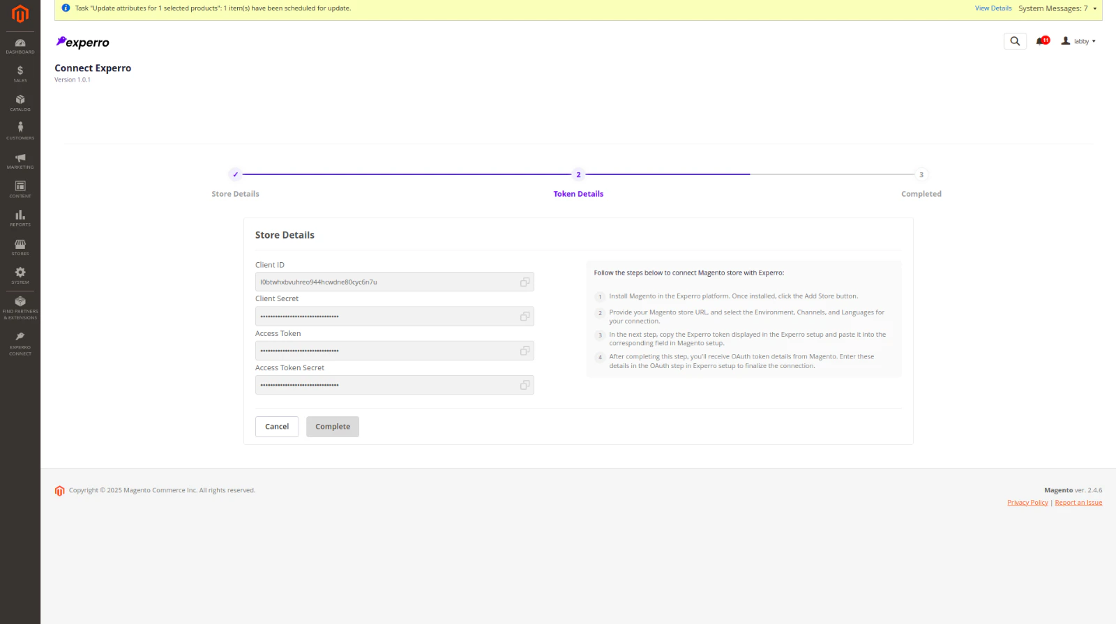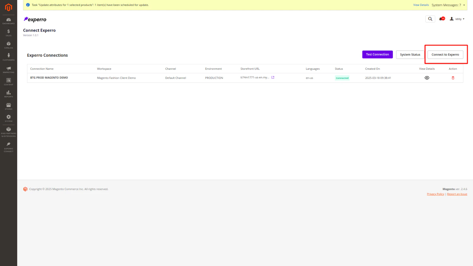Once connected, you will see the Store Details page in Magento, confirming the integration.