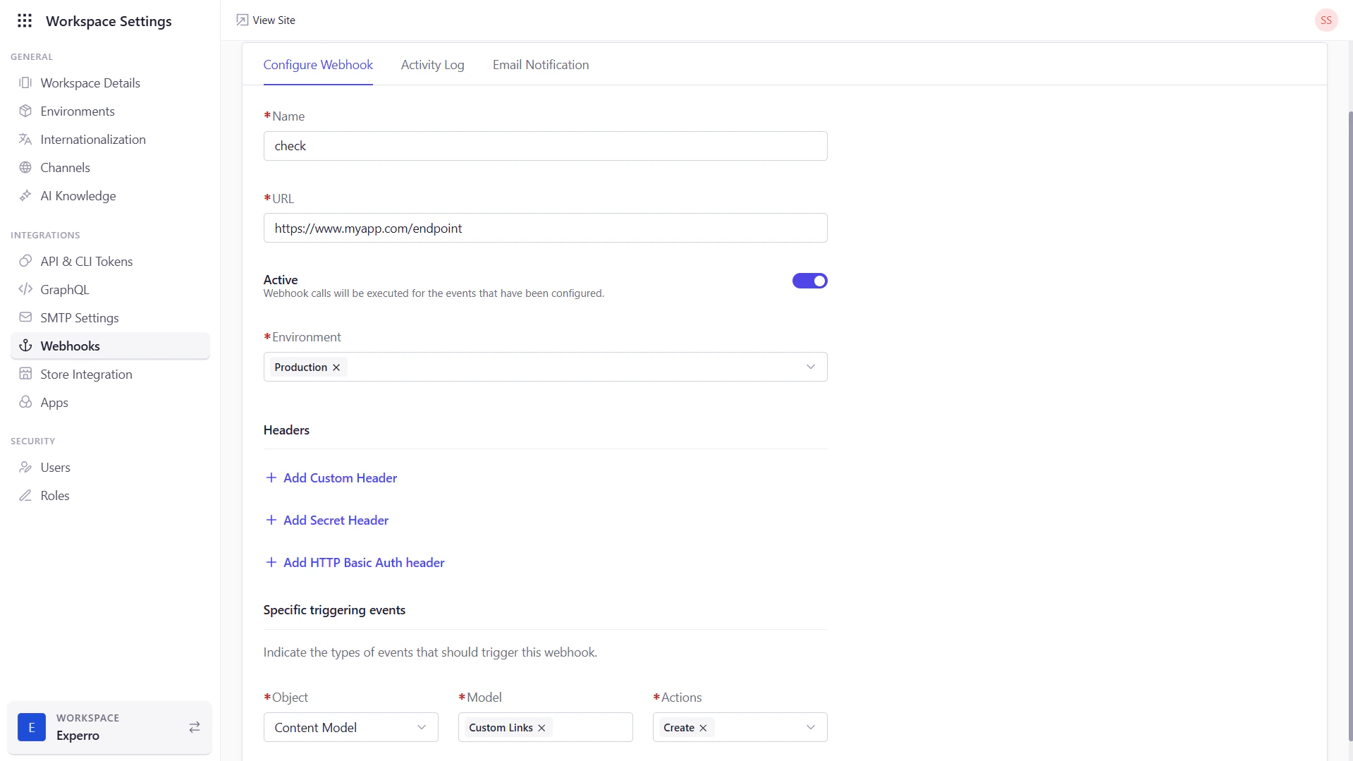 | URL | The target endpoint where Experro will POST event payloads. |