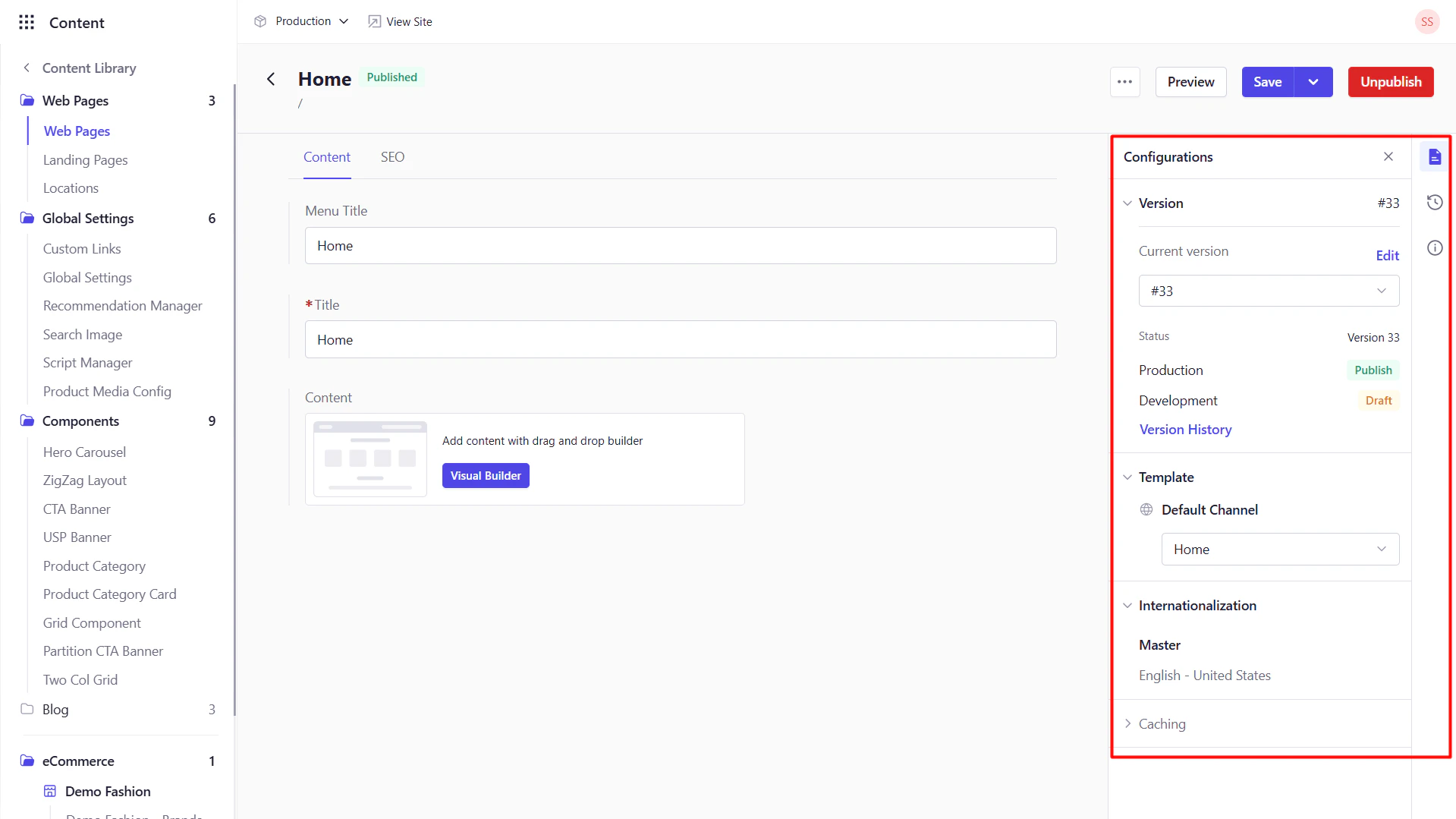 The center panel displays your schema fields and Component blocks. Enter text, upload media, select options, or launch the Visual Builder if available.