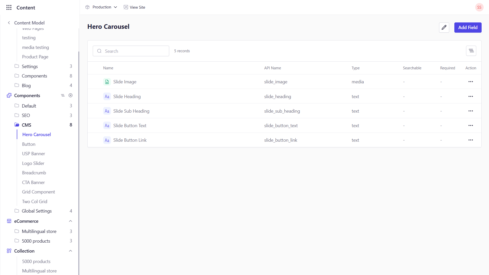 Once your component is created, you’ll land on its Fields tab:- Click + Add Field.