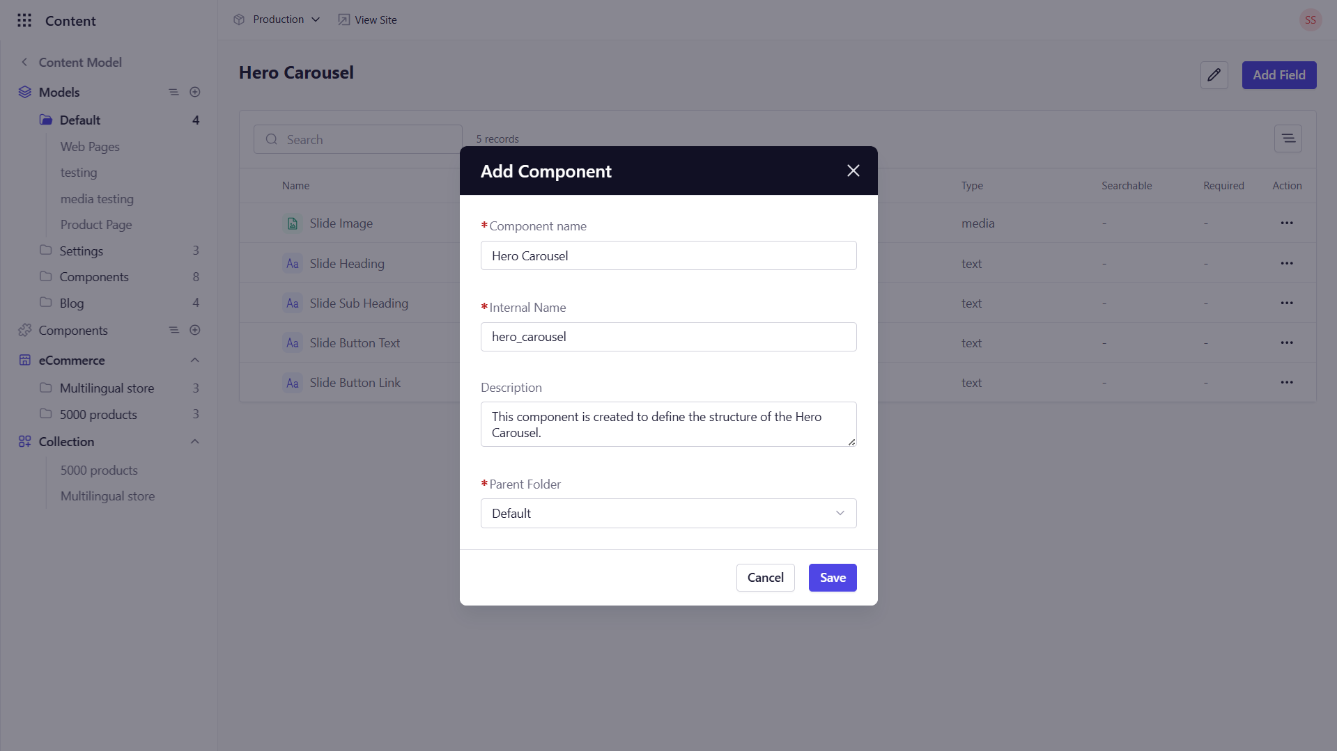 - Create Slides in Content Library by adding 3–5 instances under the carousel field.