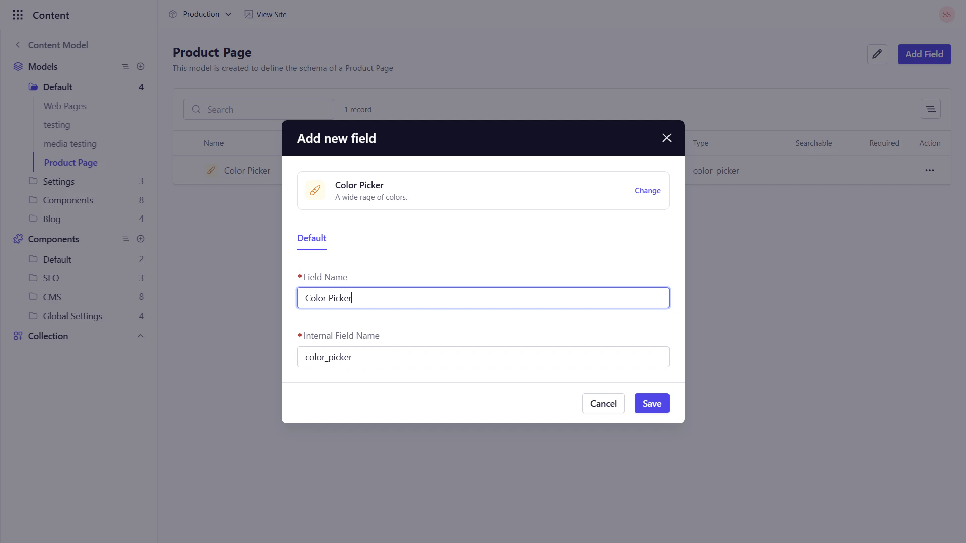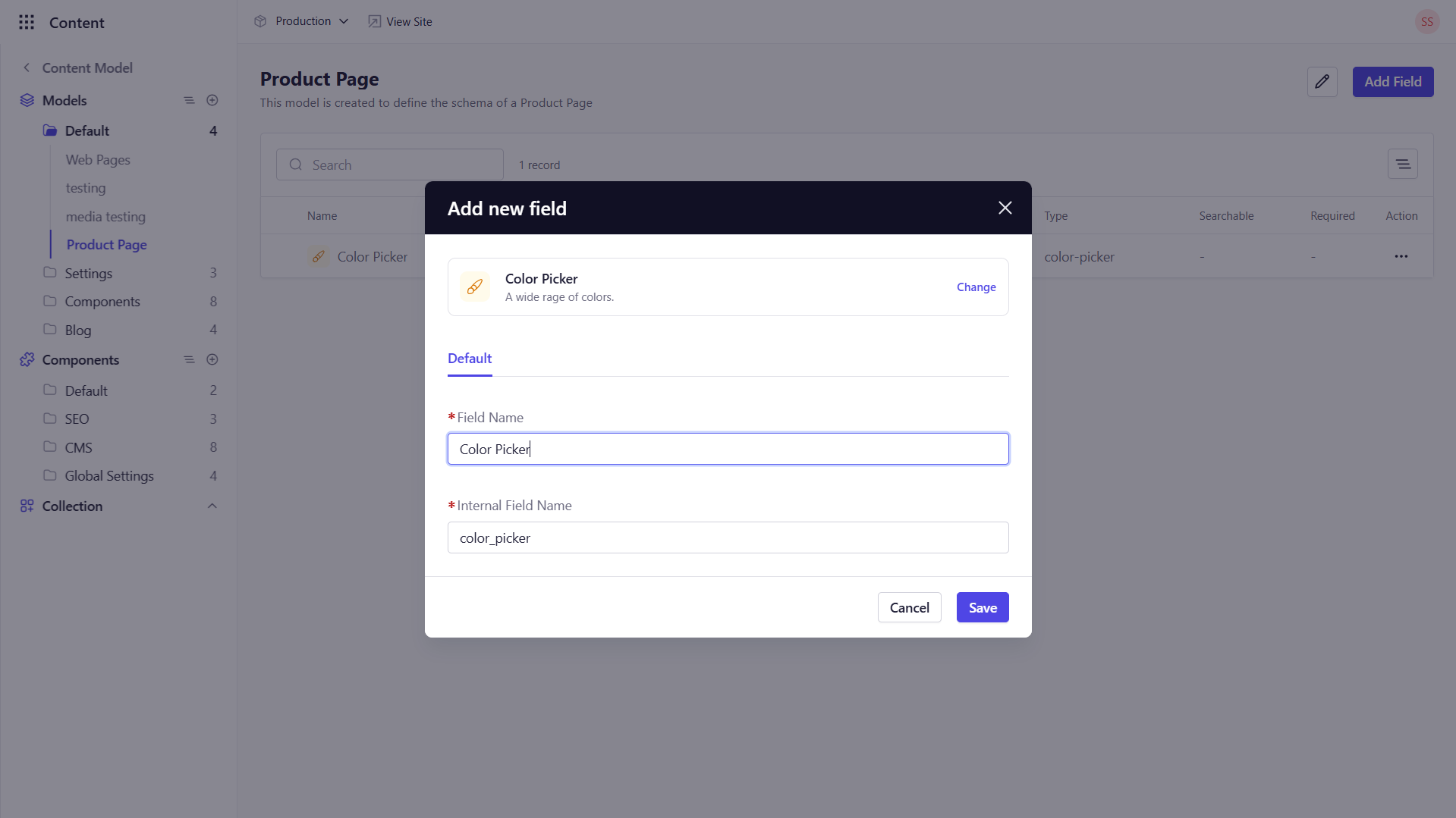 The Color Picker field offers a visual swatch and HEX‑code selector, perfect for theme or brand color inputs. This field can be used to capture color values in the following scenarios among many others:- Defining brand colors for page sections or components.