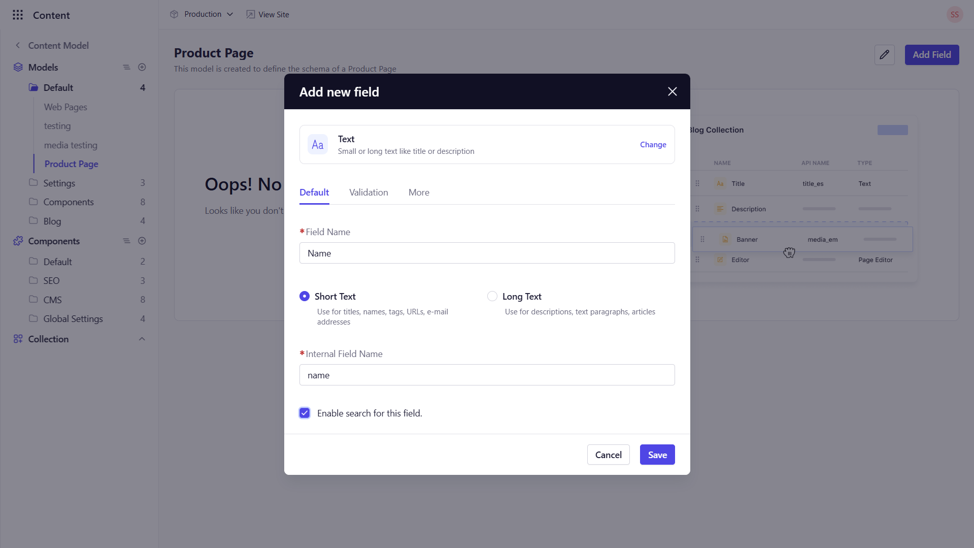 - Short : Select this button if the field is used for a single-line input.