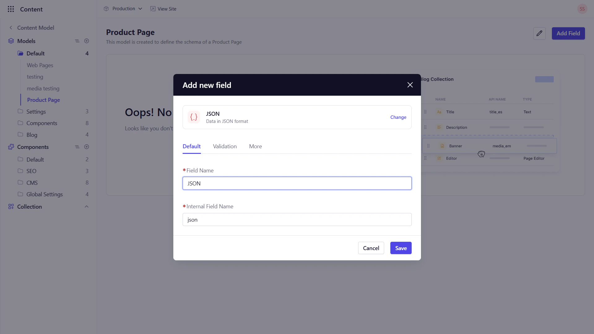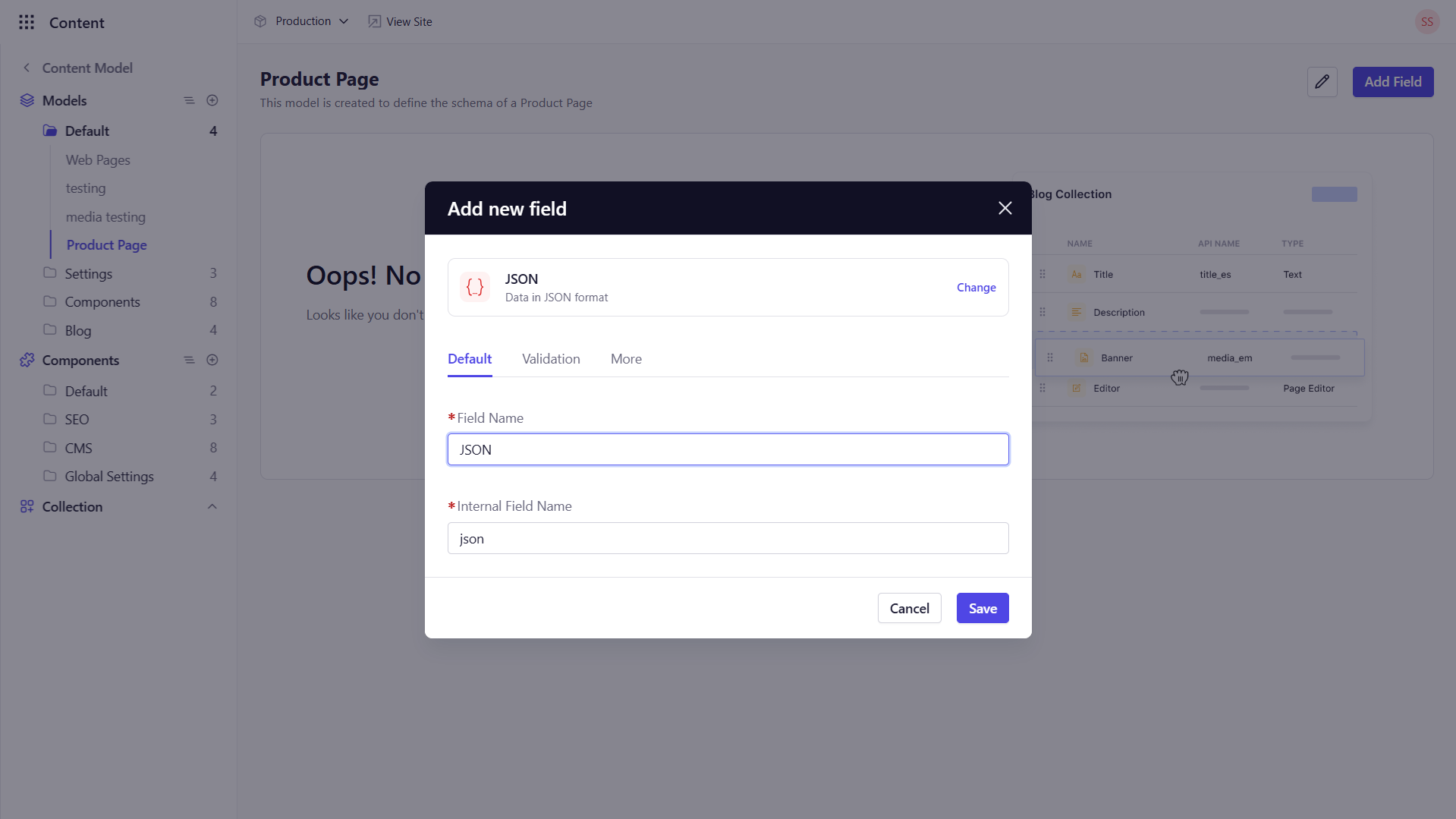The JSON field allows editors to store raw JSON objects or arrays via a code editor interface.Key Configuration Options
