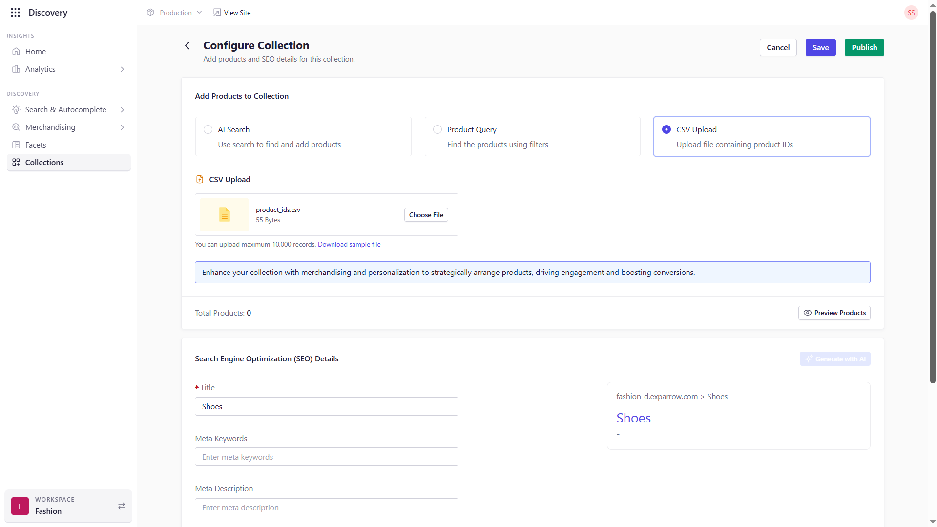 For full control, upload a CSV of up to 10,000 SKUs to lock in a precise list. Ideal for one-off promotions or editorial features.- Example: “Executive Gift Guide” for corporate clients—hand-picked leather portfolios, premium pens, and monogrammed notebooks.