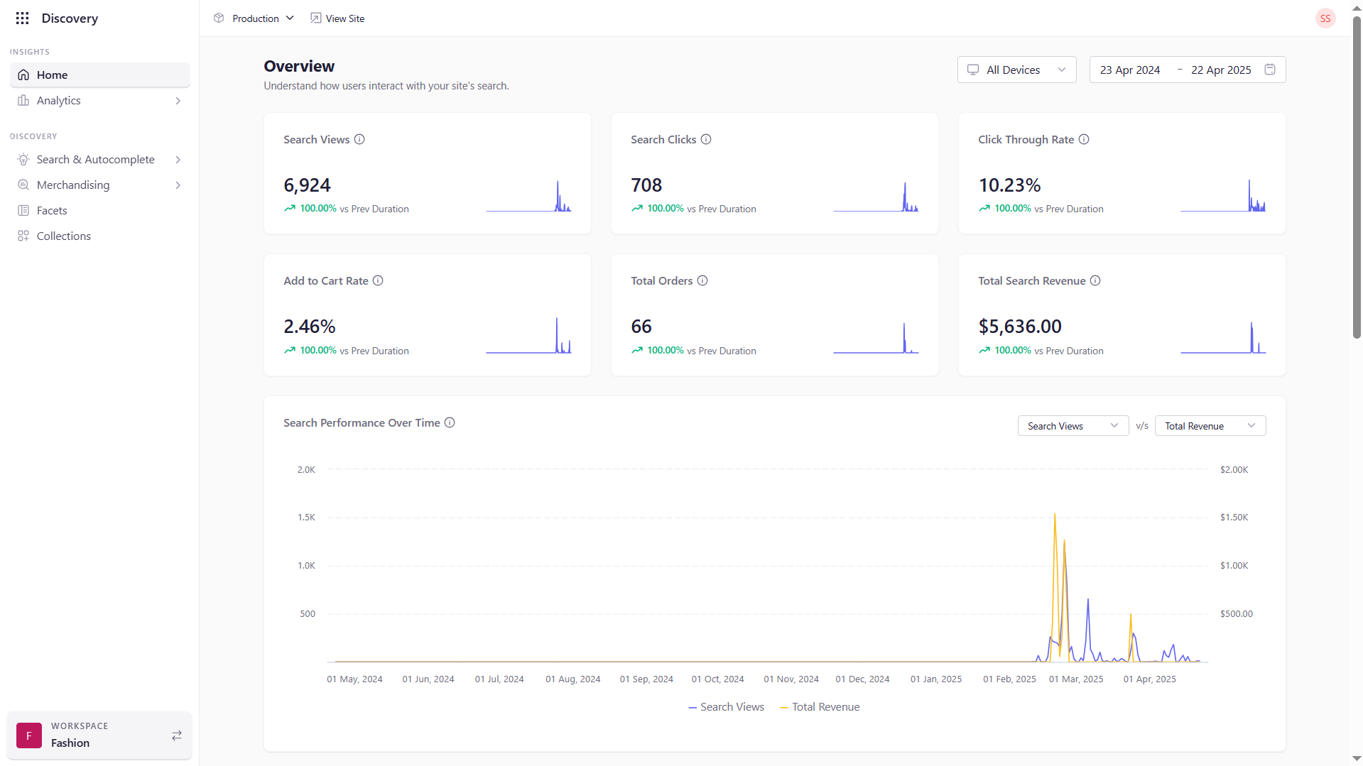 The Home screen in Experro Discovery is designed as a dynamic, data-driven hub that provides immediate insight into your store’s search performance. The Home screen integrates interactive widgets that offer real-time metrics and trends to help you make informed decisions. Key Widgets on the Home Screen These widget gives you a comprehensive snapshot of your search performance. It displays critical metrics such as: