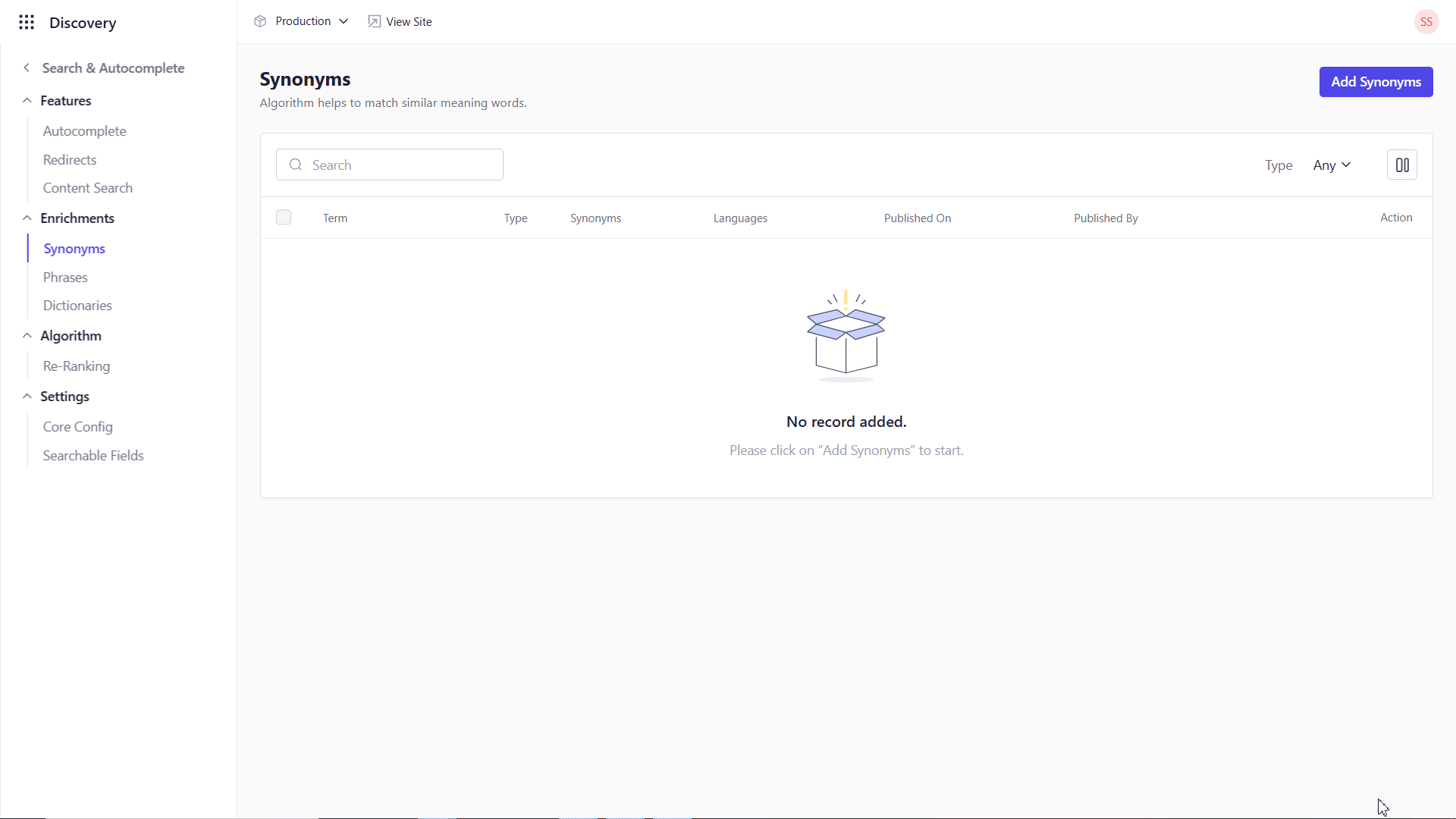 - Navigate to the Synonyms tab within Search & Autocomplete.