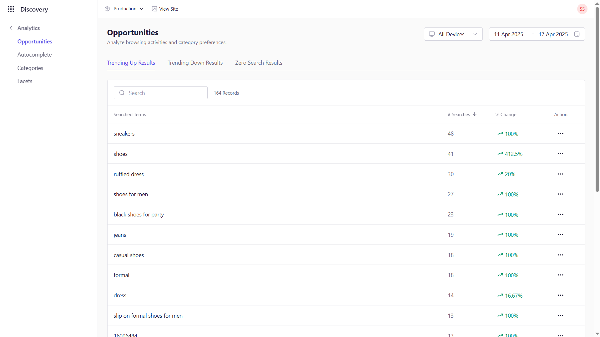 The Opportunities Dashboard organizes actionable search insights into three tabs:- Trending Up Results: