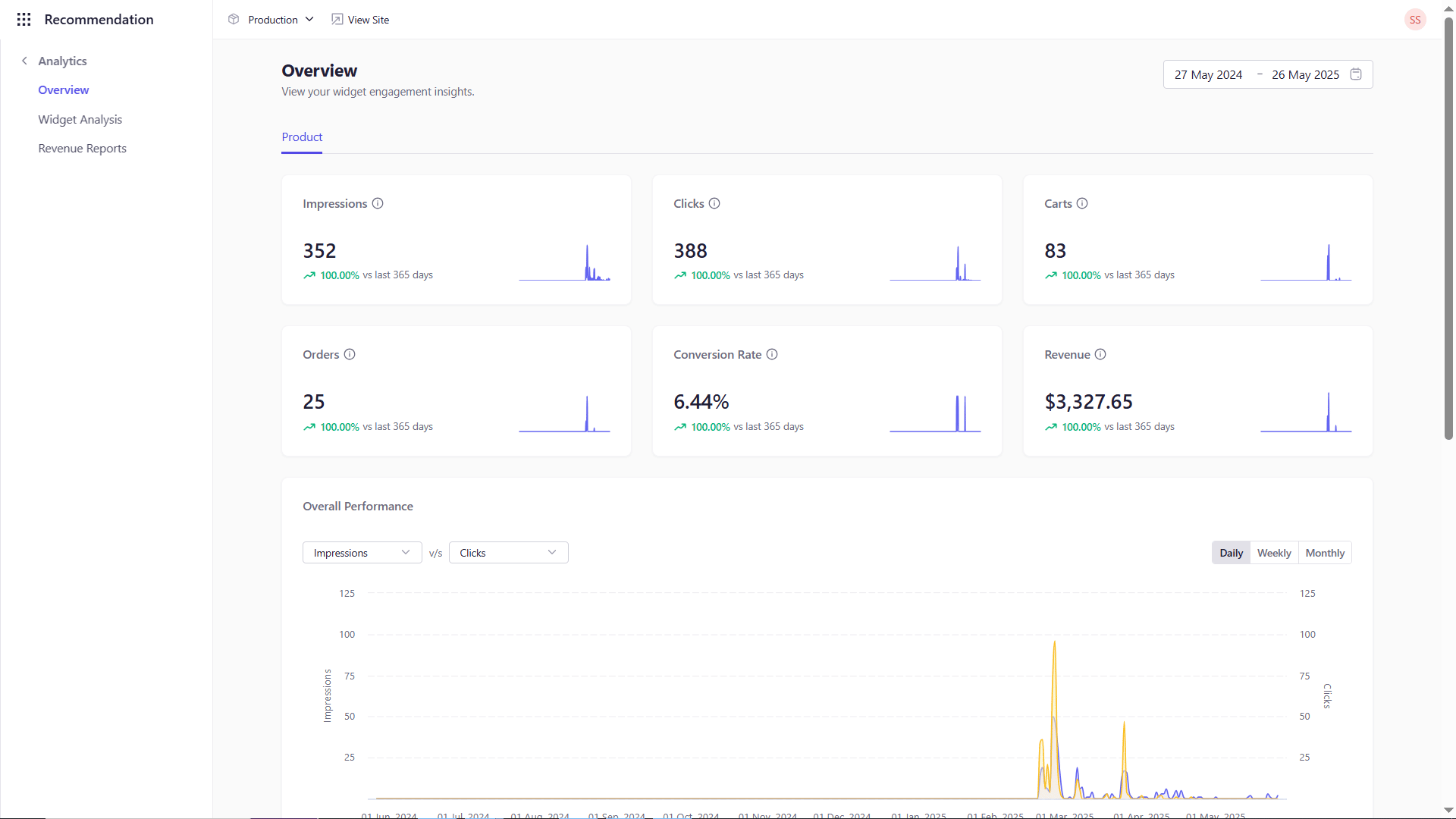 This section represents a deep dive into the performance of individual widgets. See widget-level impressions, clicks, carts, orders, conversion rate, and revenue in a compact summary.Revenue Reports