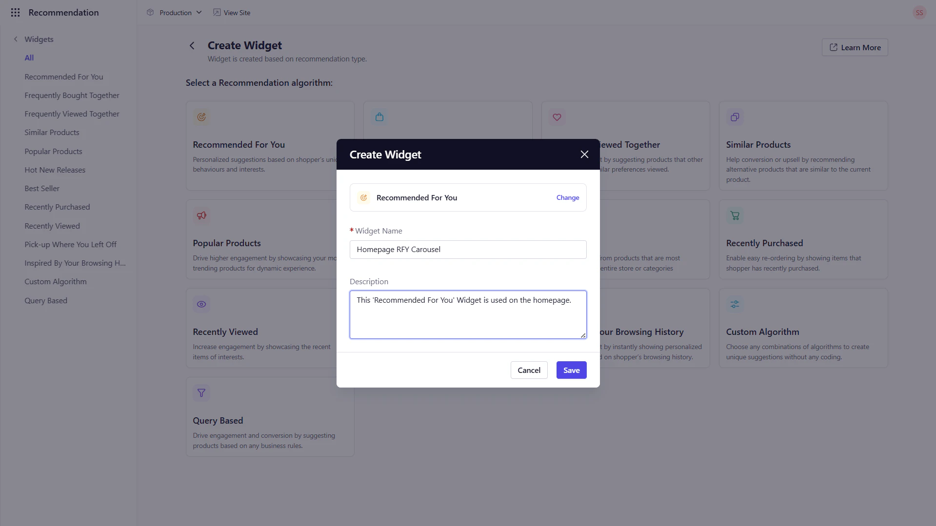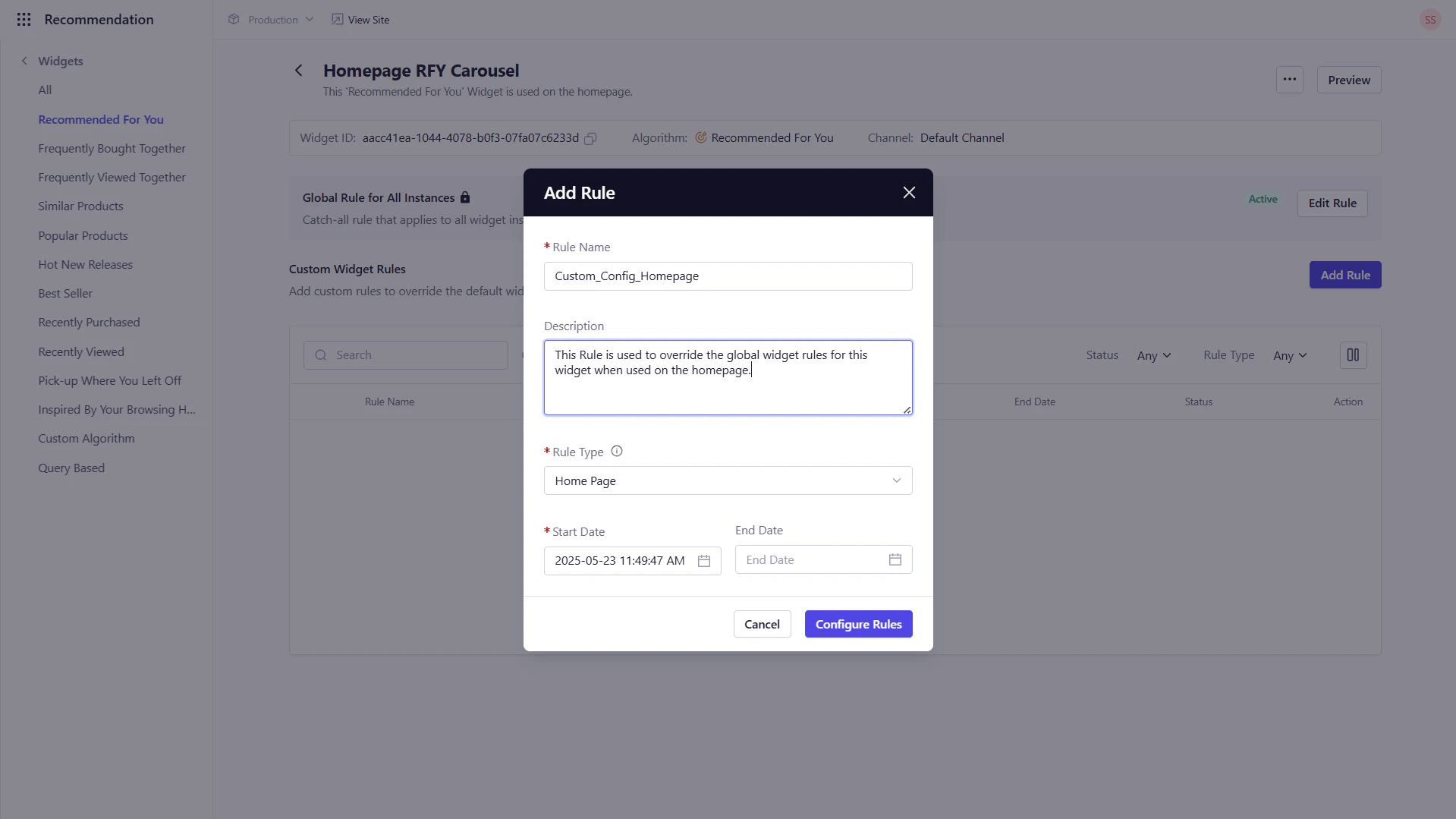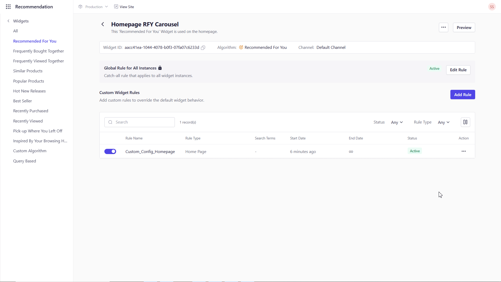 - Widget Name: A descriptive title (e.g. “Homepage RFY Carousel”).