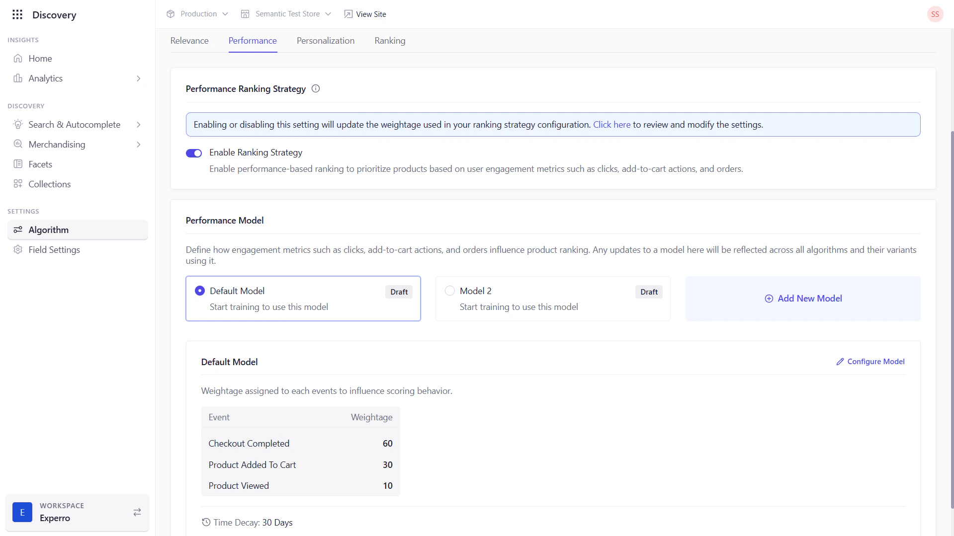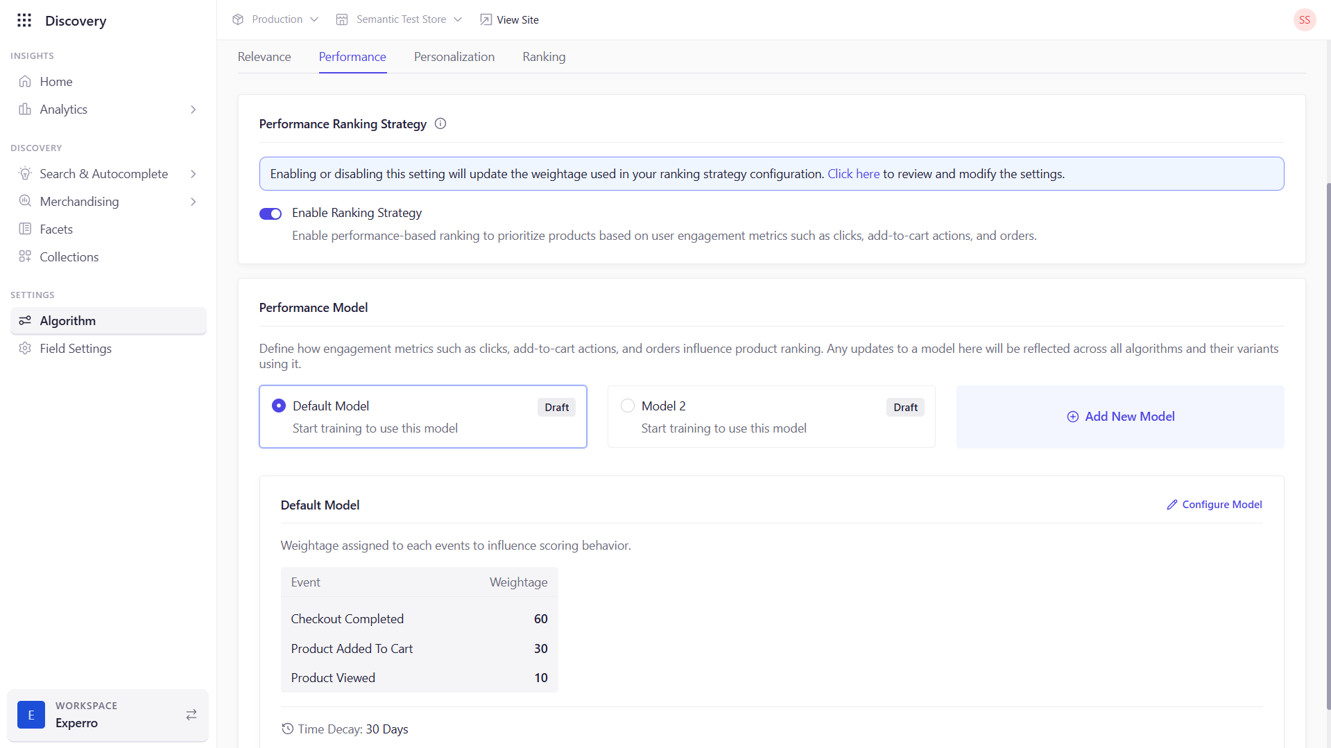 - When ON, Experro blends your selected performance model’s score into final rankings.