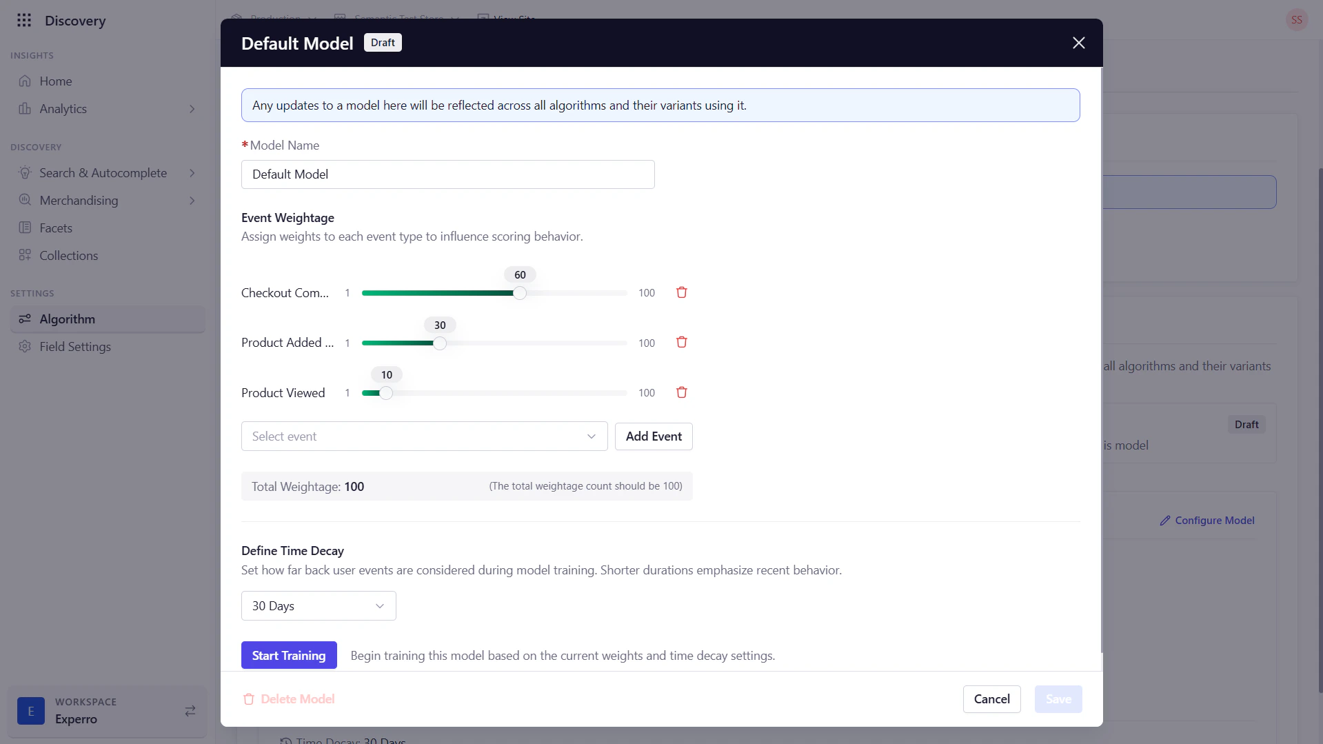 - Ensure your chosen model remains selected then click on Activate after saving model details so Experro applies its performance score alongside other algorithm signals in real time.