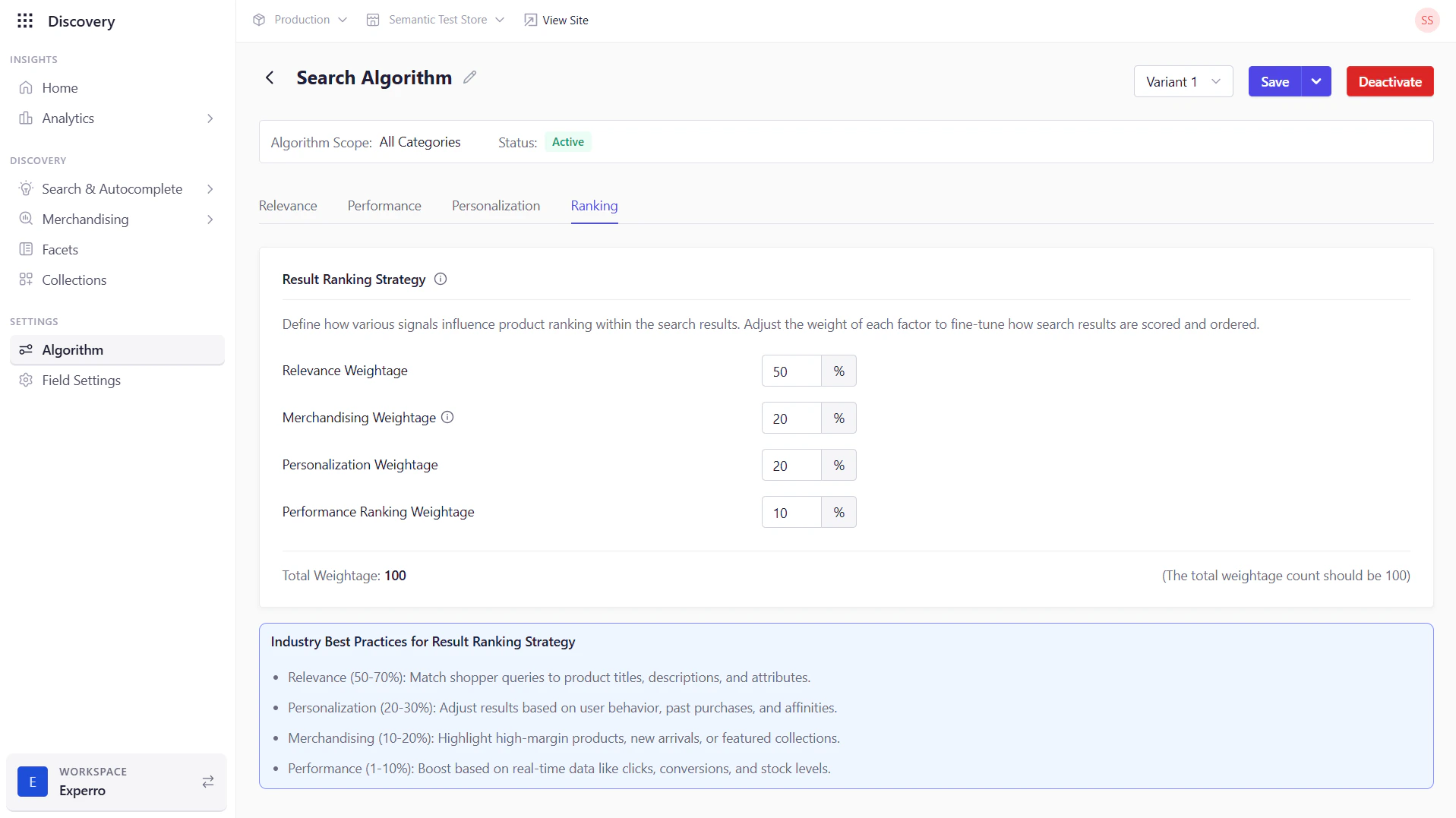 | Performance Ranking Weightage (%) | Percentage for engagement-based signals (clicks, conversions, stock levels) to influence ranking. |