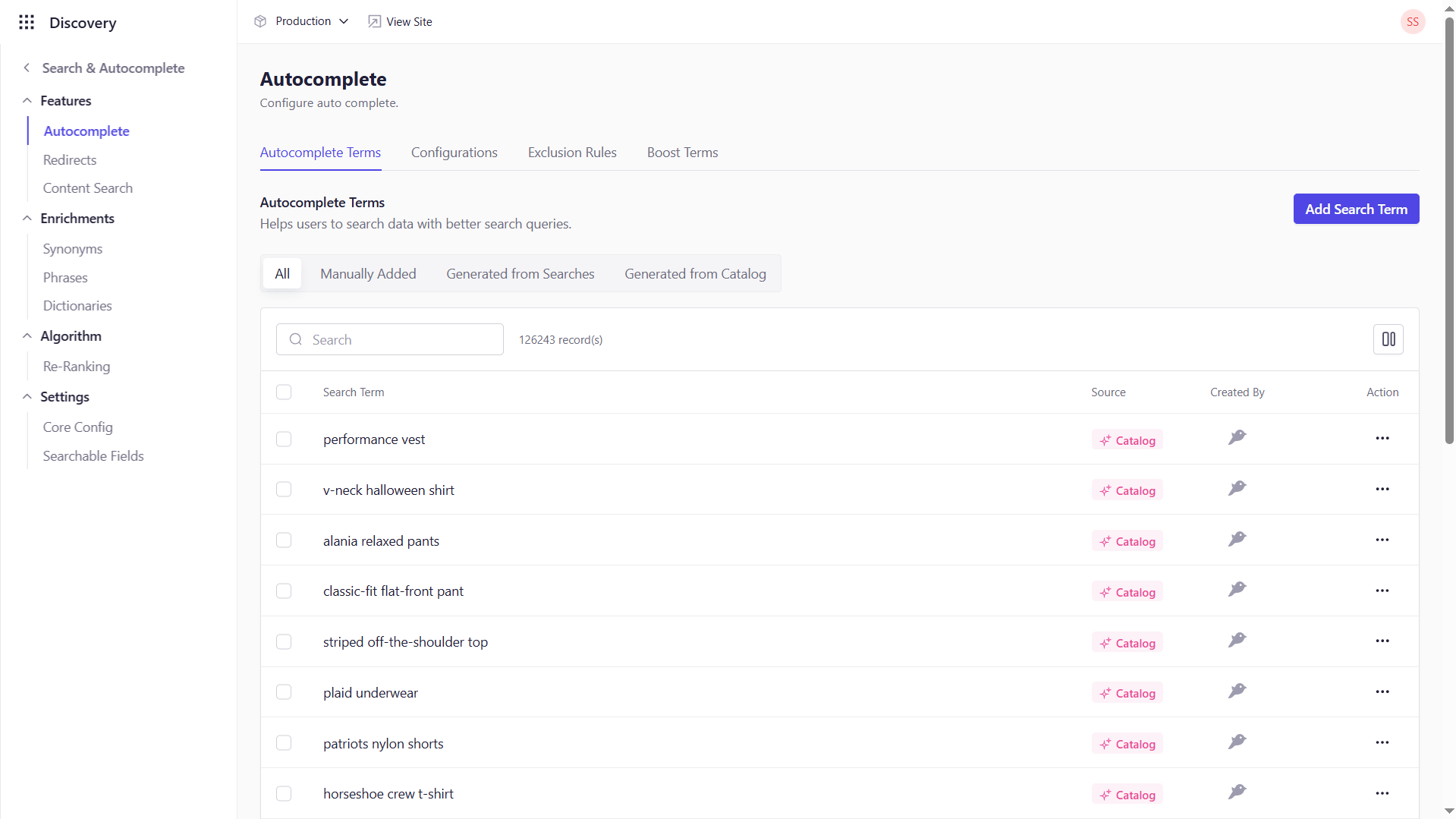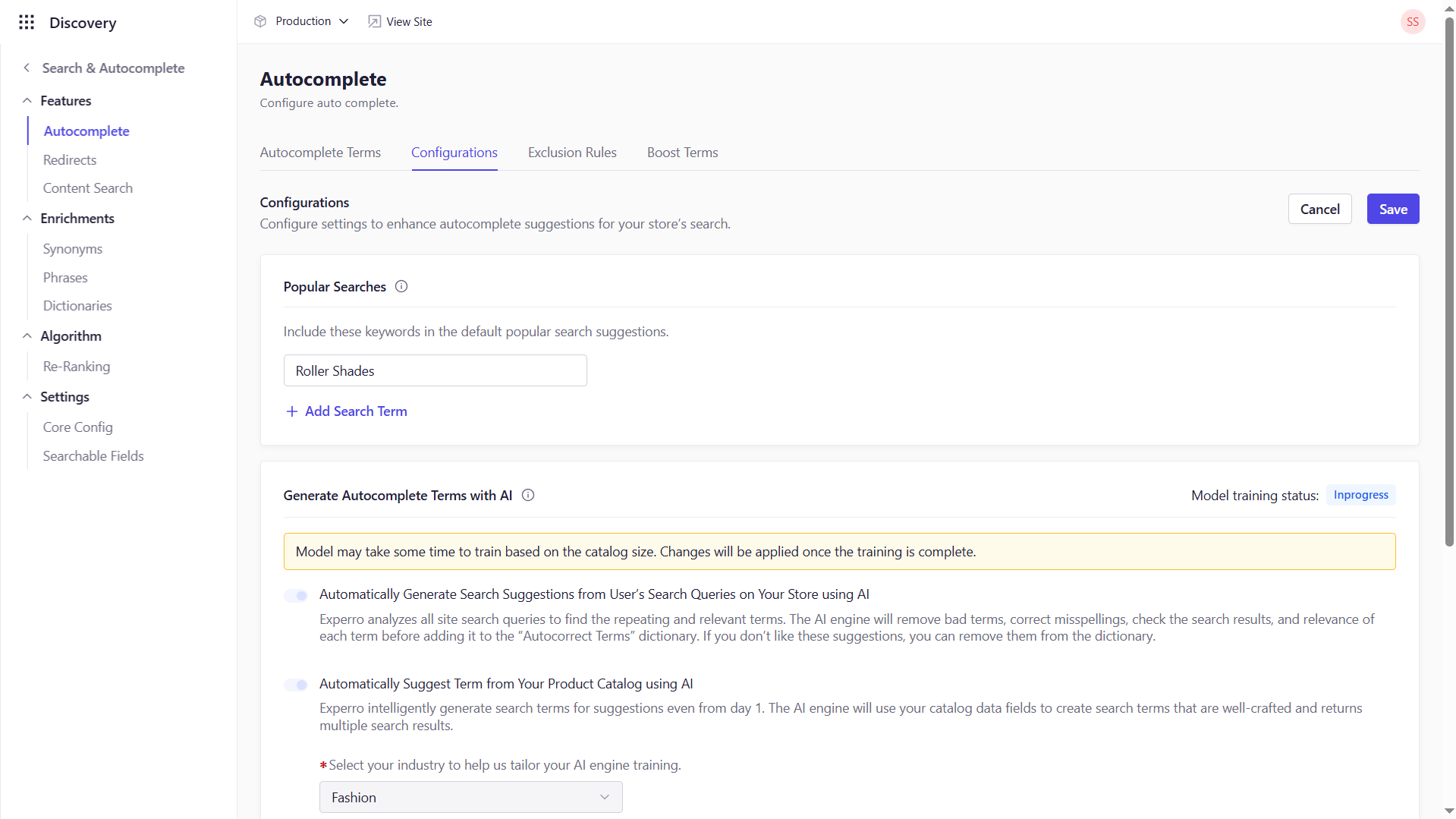 Experro’s Autocomplete feature is designed to streamline the search process and enhance user engagement. By providing real-time suggestions as users type in the search bar, Autocomplete not only accelerates the search experience but also improves the accuracy of search results. This functionality enables customers to quickly find what they’re looking for—reducing frustration and boosting conversion rates.Configuration Guide