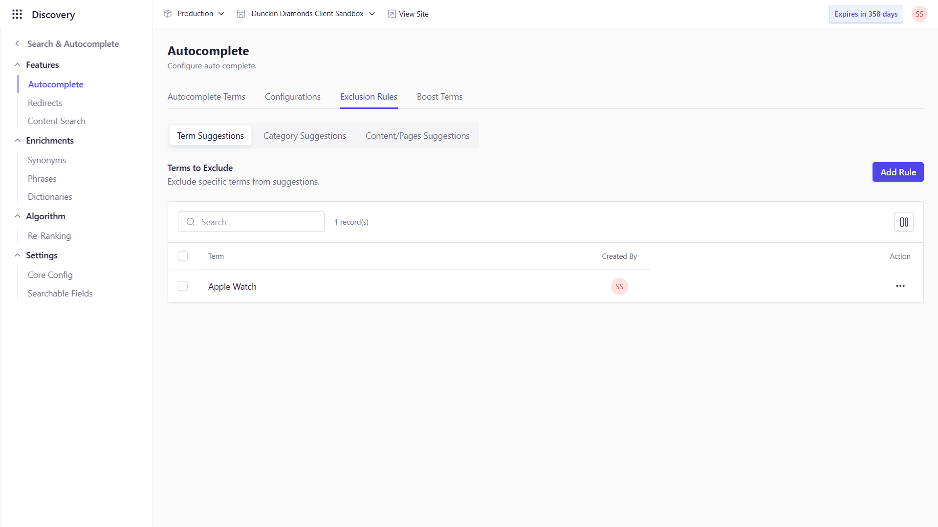 - Add Exclusion Rule: Click on Add Rule to input a search term or pattern that should be excluded from autocomplete suggestions.