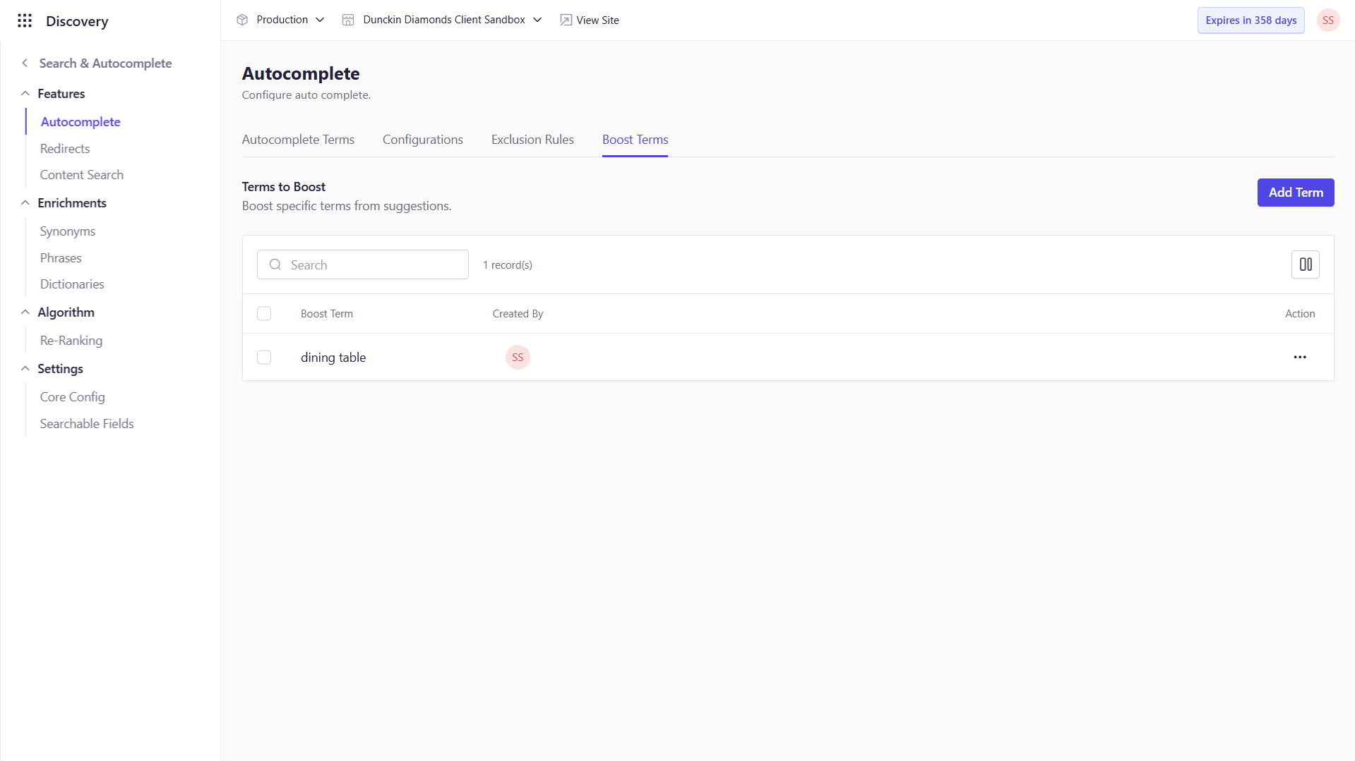 - Add Boost Term: Click on Add Term to designate a term that should receive priority in autocomplete suggestions.