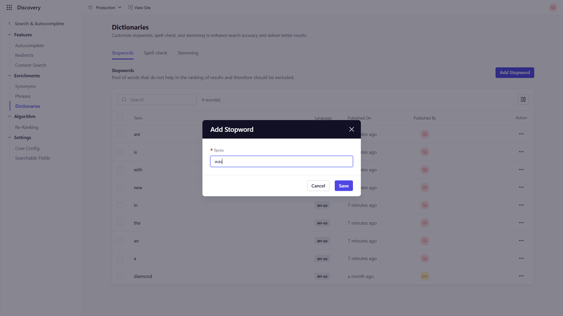 - Go to Discovery → Search & Autocomplete, then select the Dictionaries tab under Enrichment .