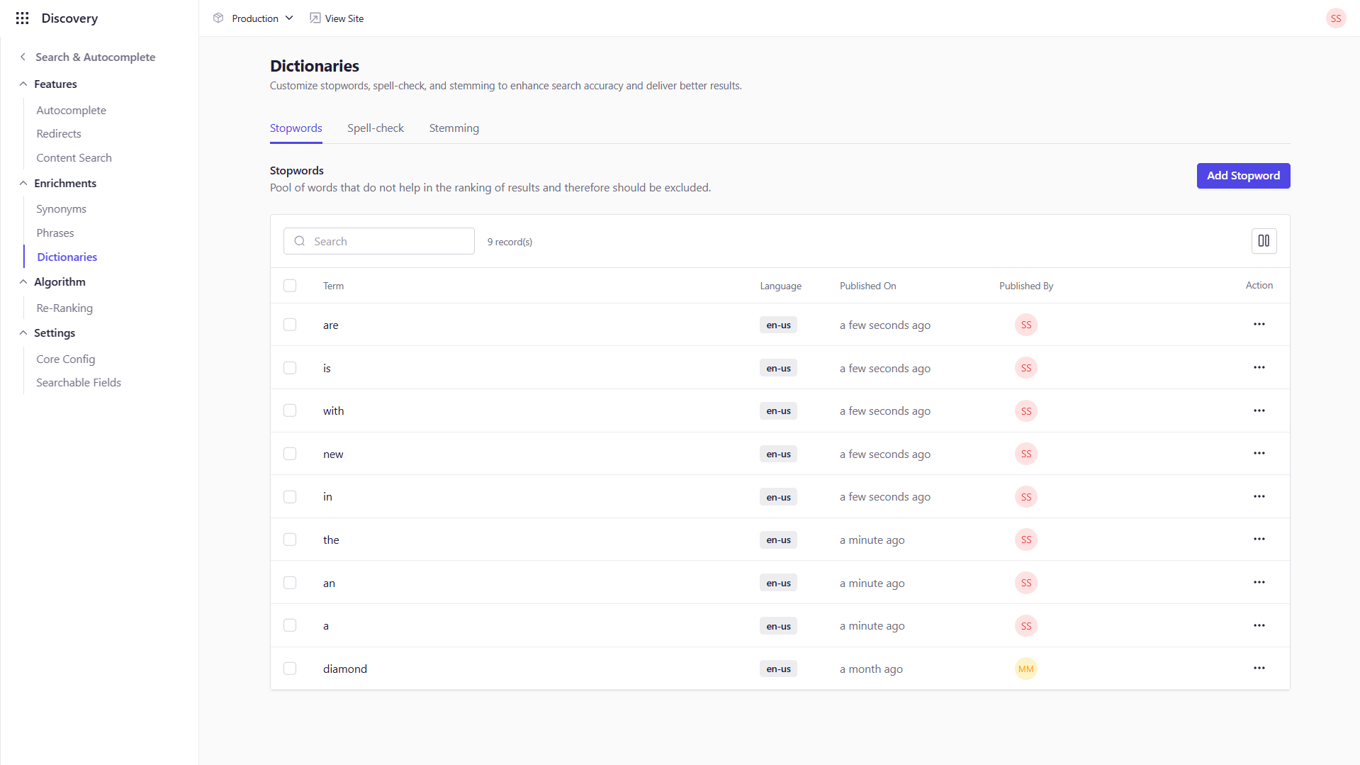 - Use the search bar at the top of the Stopwords screen to locate a specific stopword by entering the term and pressing Enter.