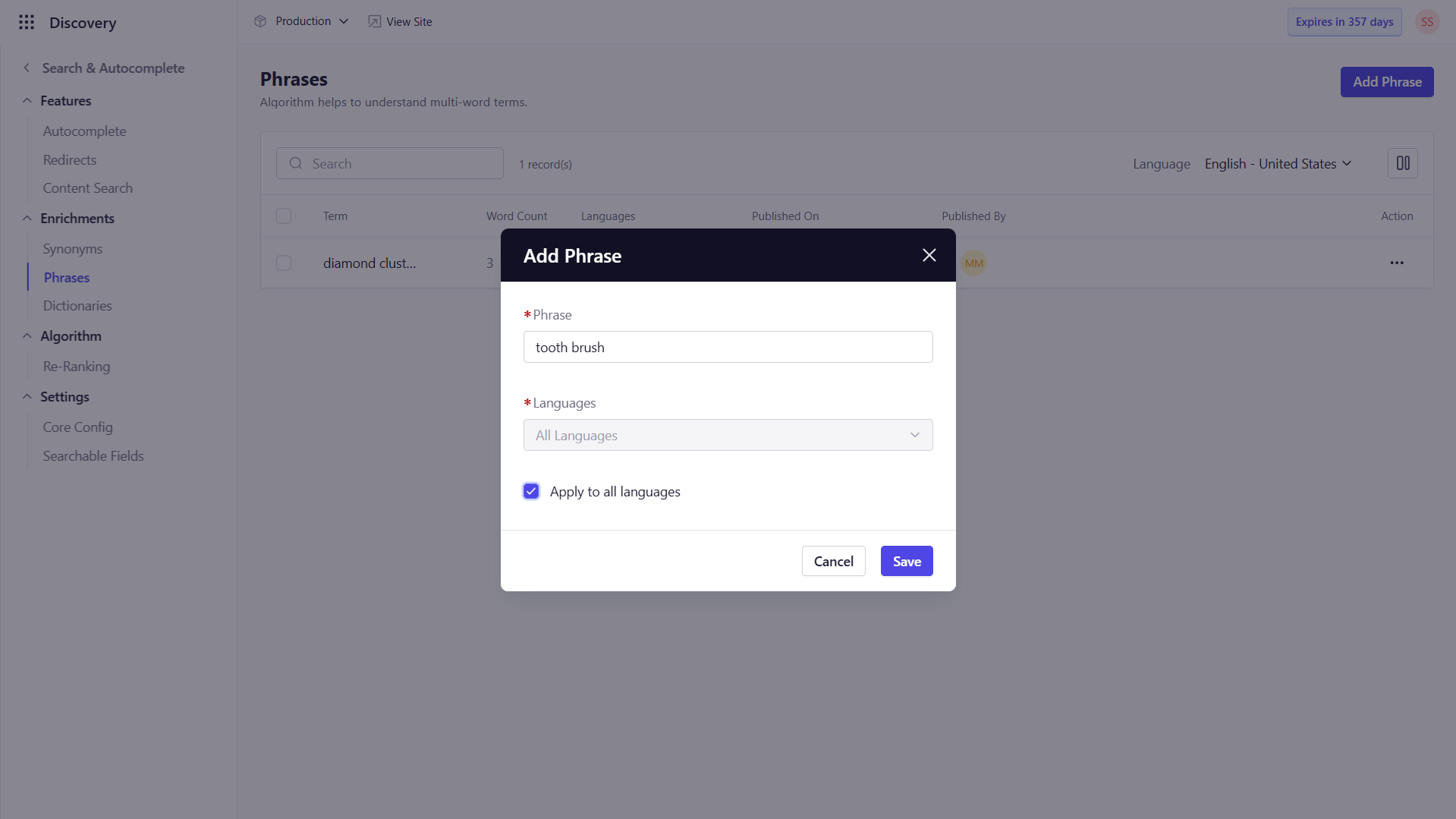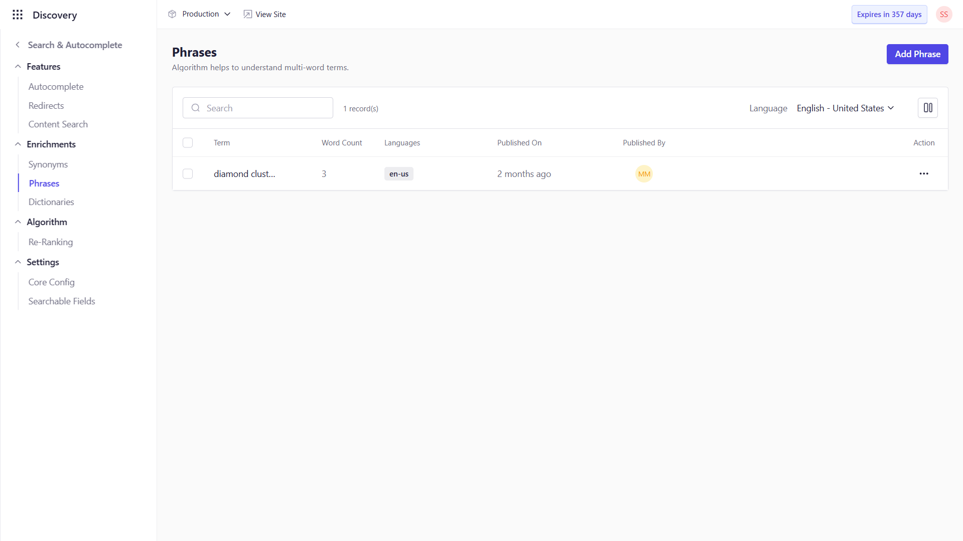 - Go to Discovery → Search & Autocomplete, and then select the Phrases tab to view the list of existing phrases.