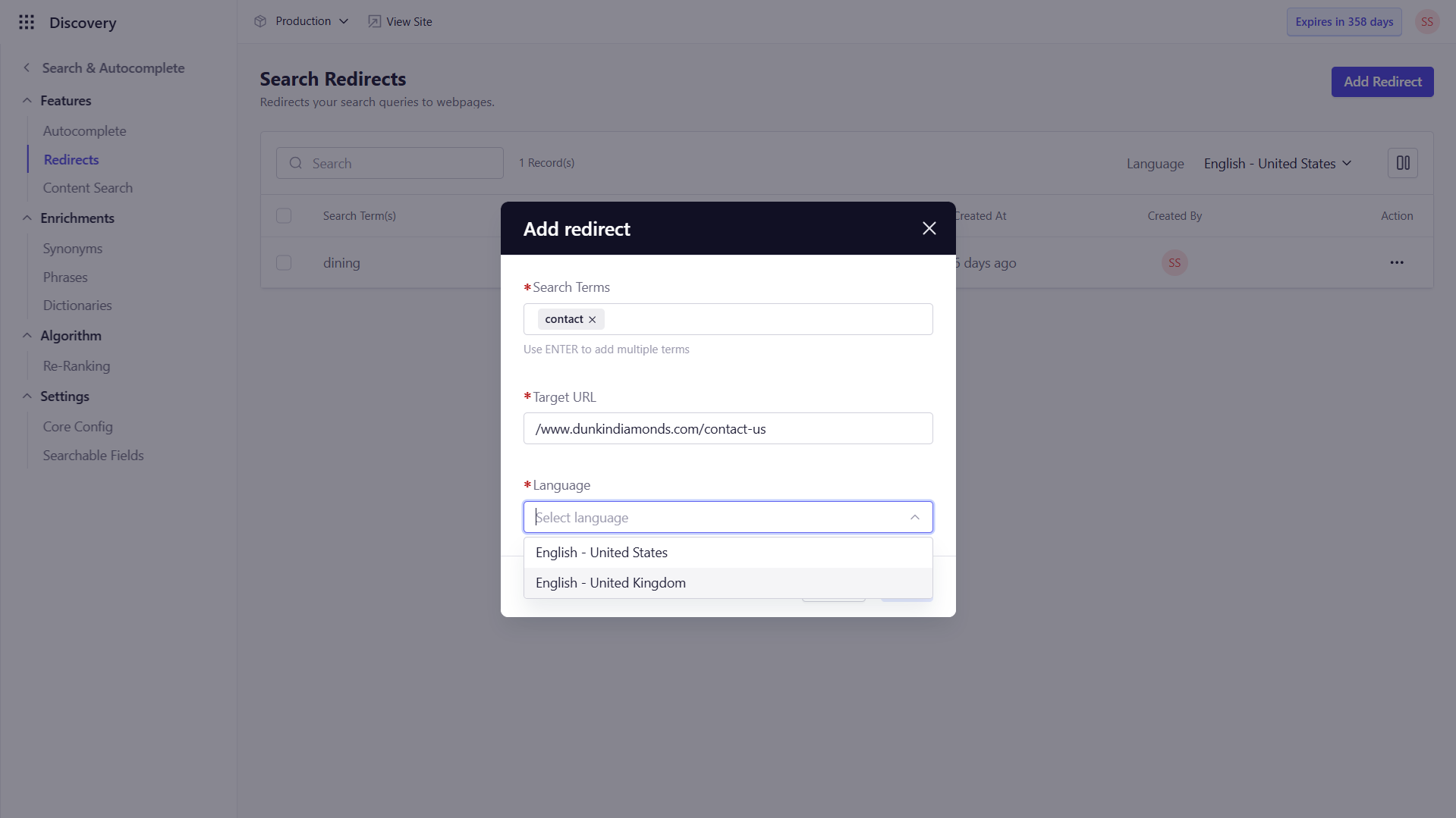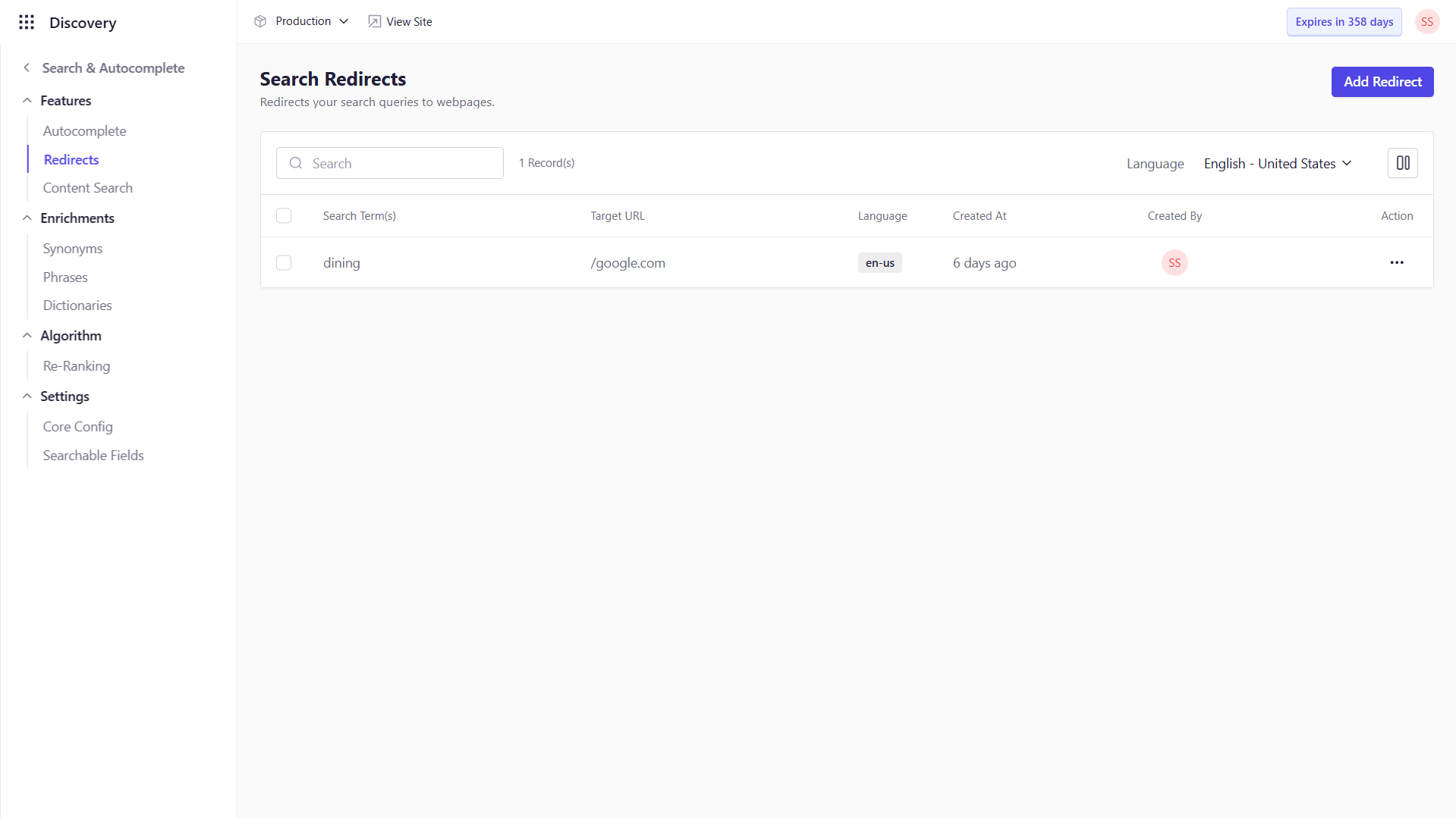 - Navigate to Discovery → Search & Autocomplete → Redirects from the left sidebar.