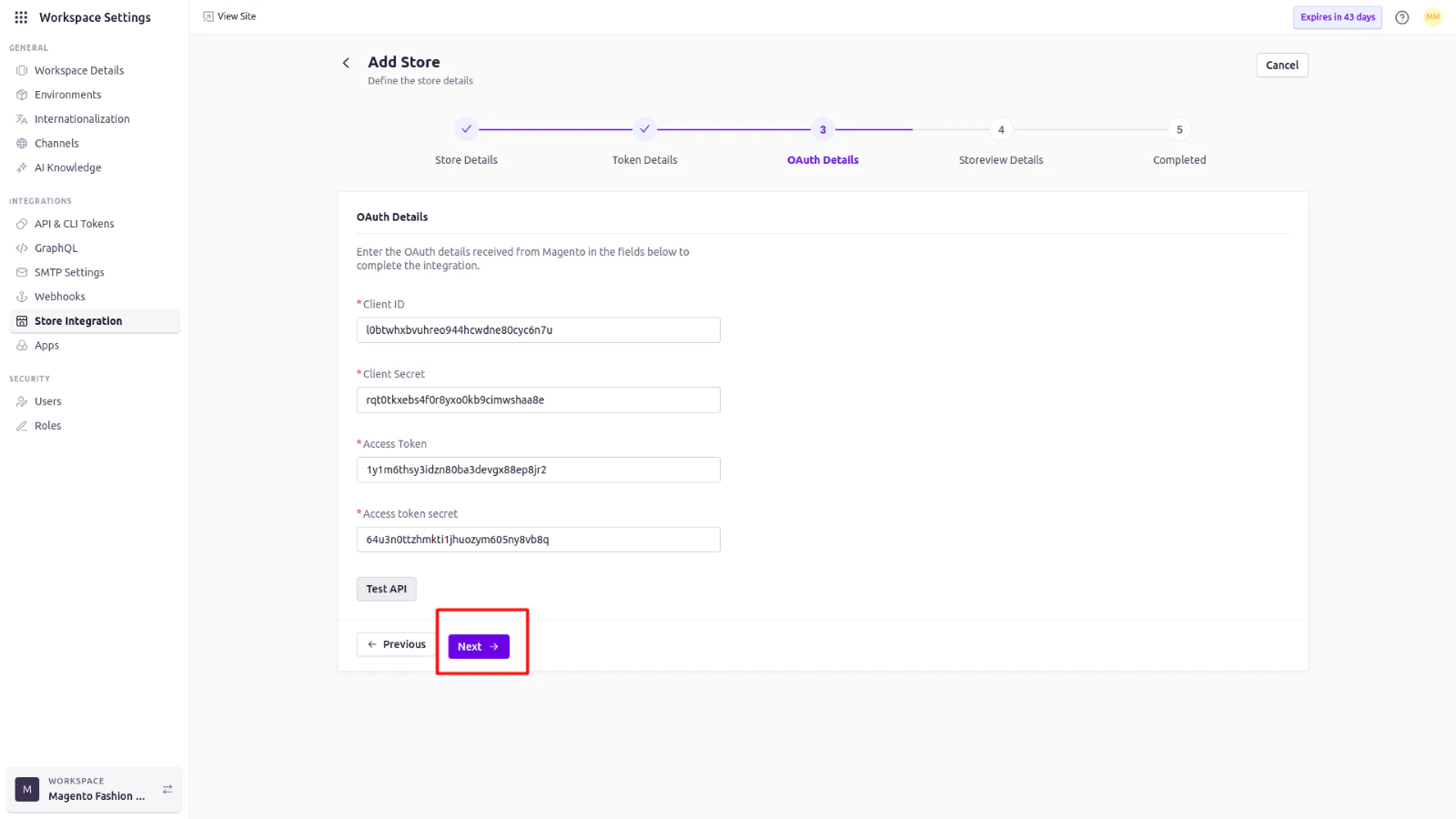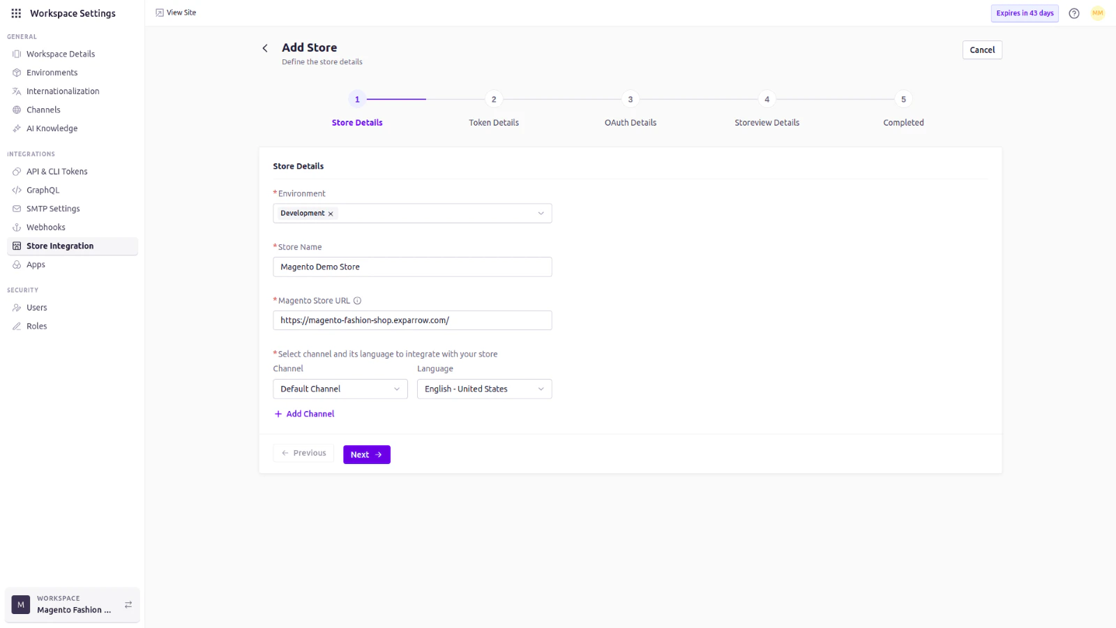 - Click Add Store and fill in the required details (Environment, Store name, Magento store URL, Channel, and Language).