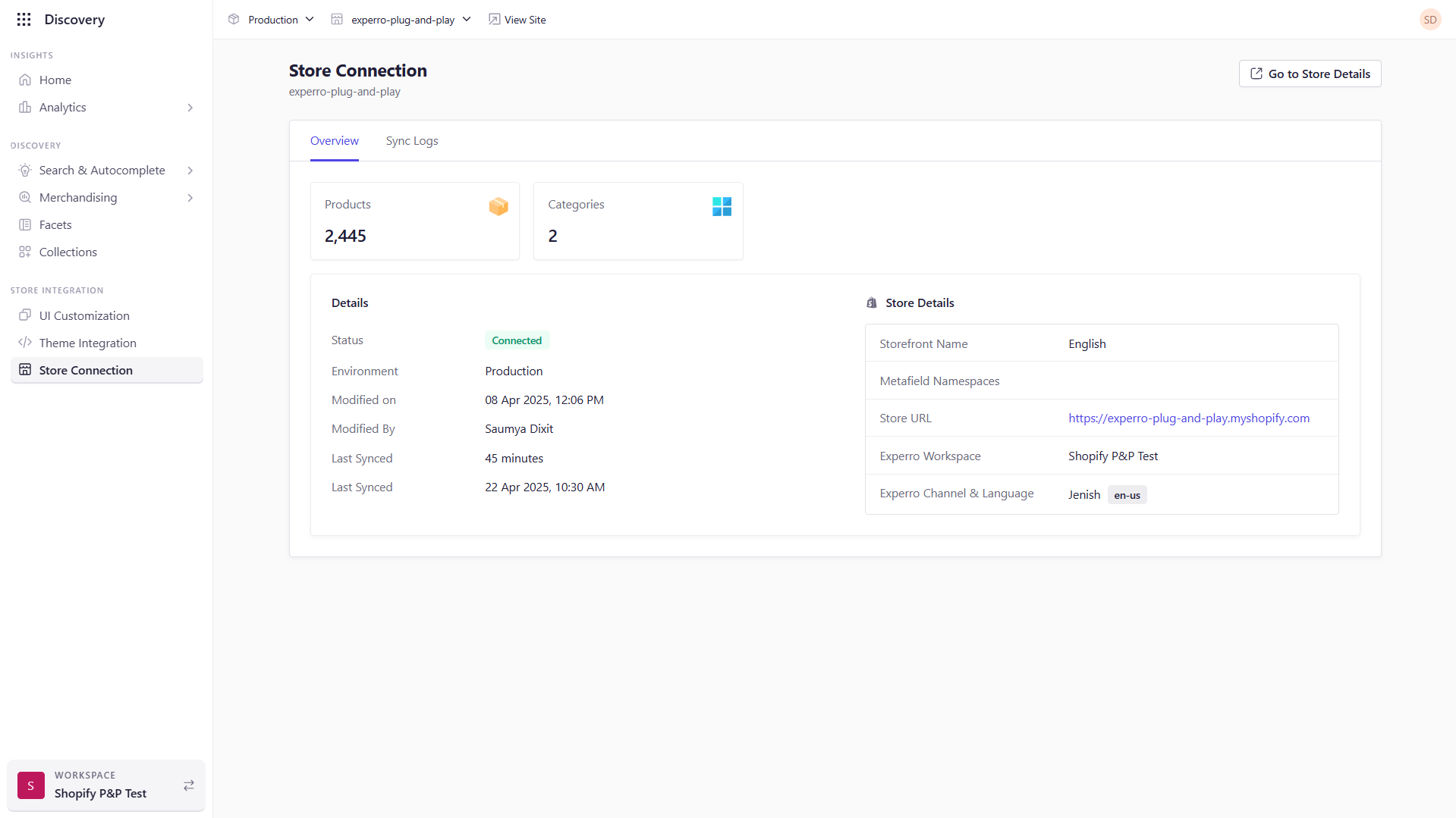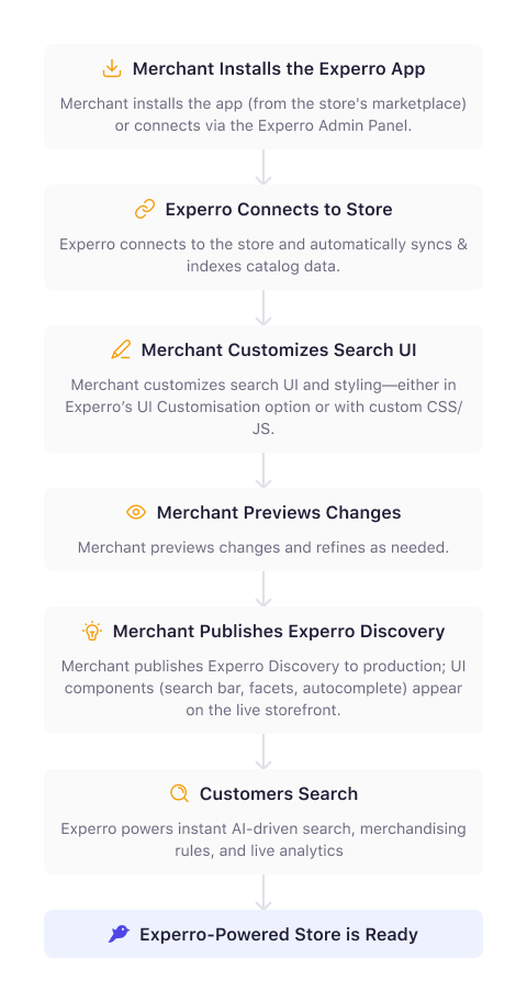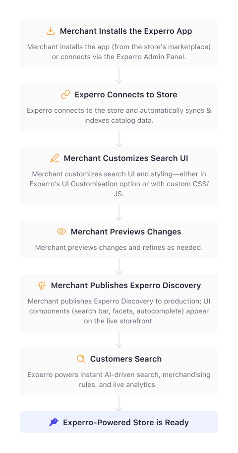 Install via the Shopify App Store or integrate using the Experro Admin panel to synchronize your product catalog and activate discovery.