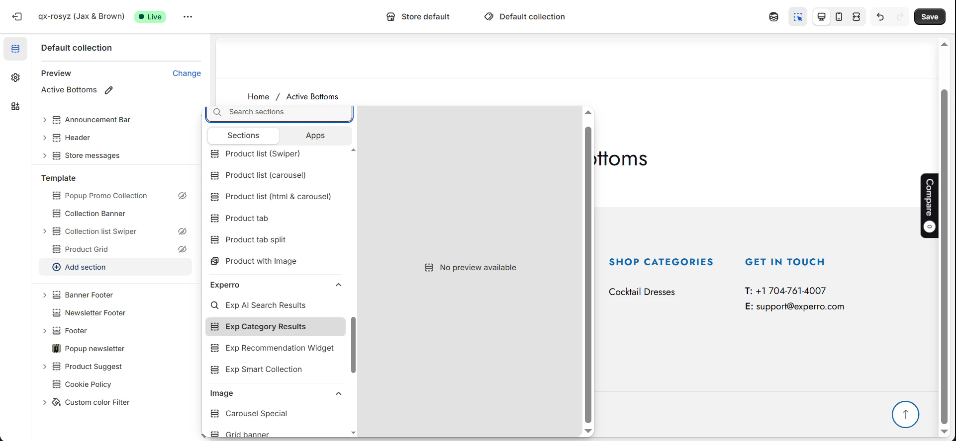 - Click Add section, then choose Exp Category Result, drag and place it where you want on your page.