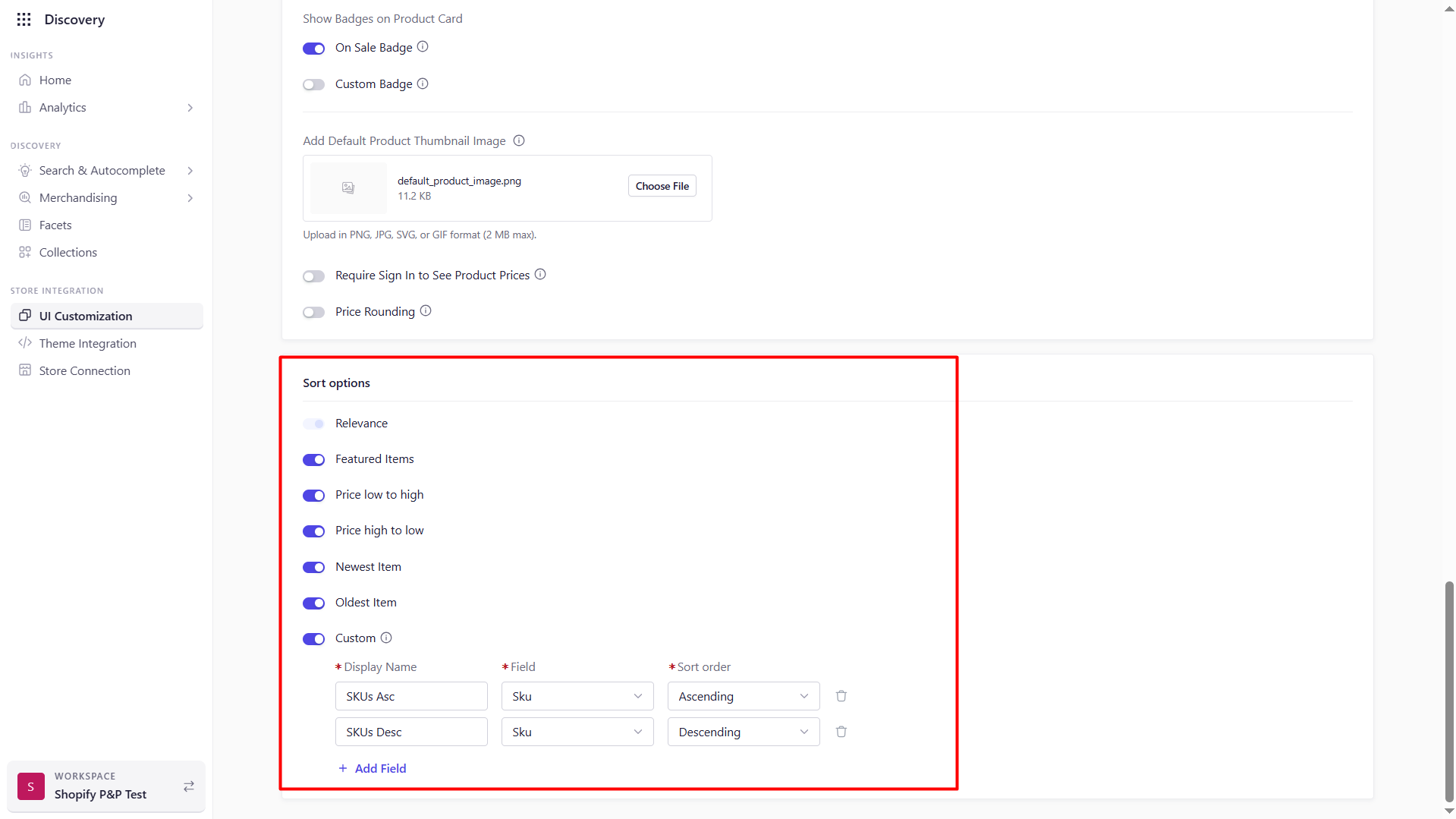 In the Experro Admin Panel, go to Discovery → UI Customization → Sort Options. -